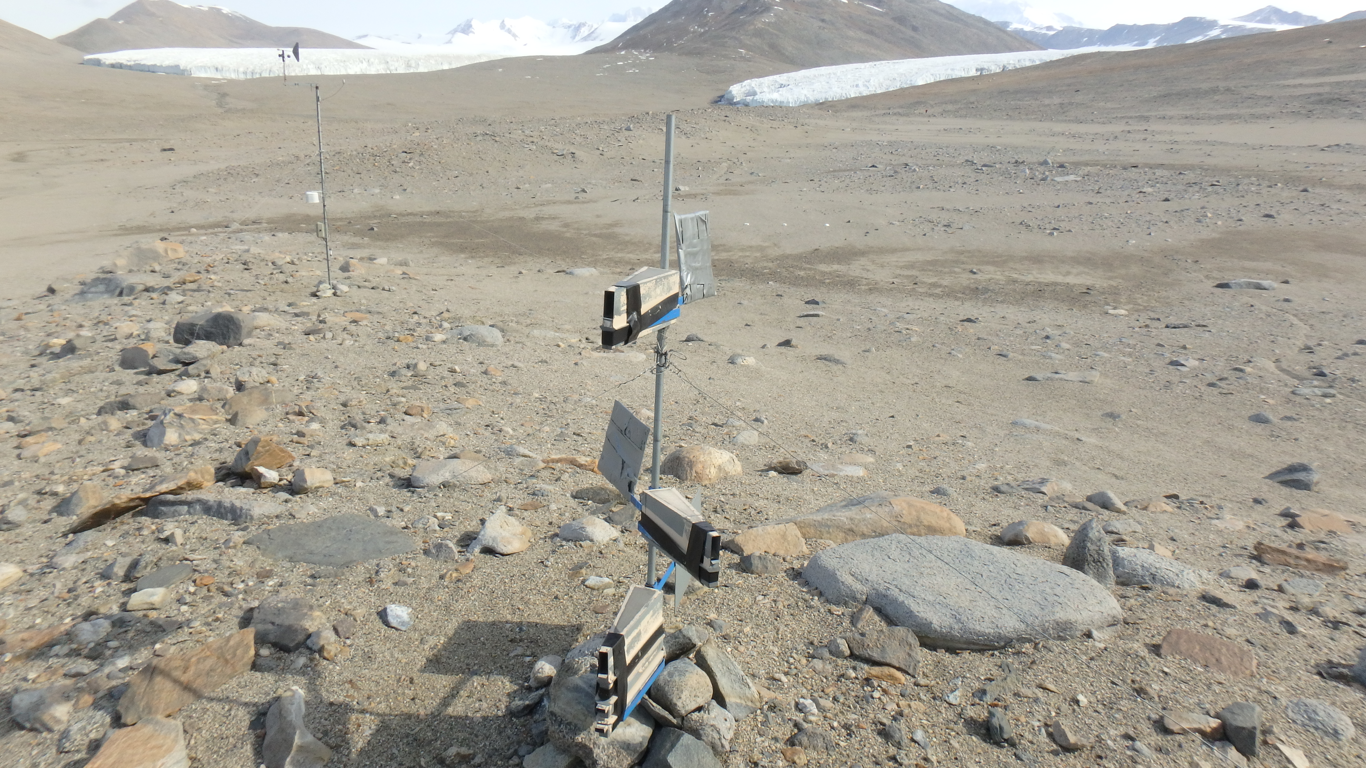 As wind blows sediment particles through the air they enter the small openings on this sediment collector. Air passes through the trap but the sediment is left behind. The fins at the back of the trap keep the opening pointed toward the wind. Miers Valley, Antarctica.