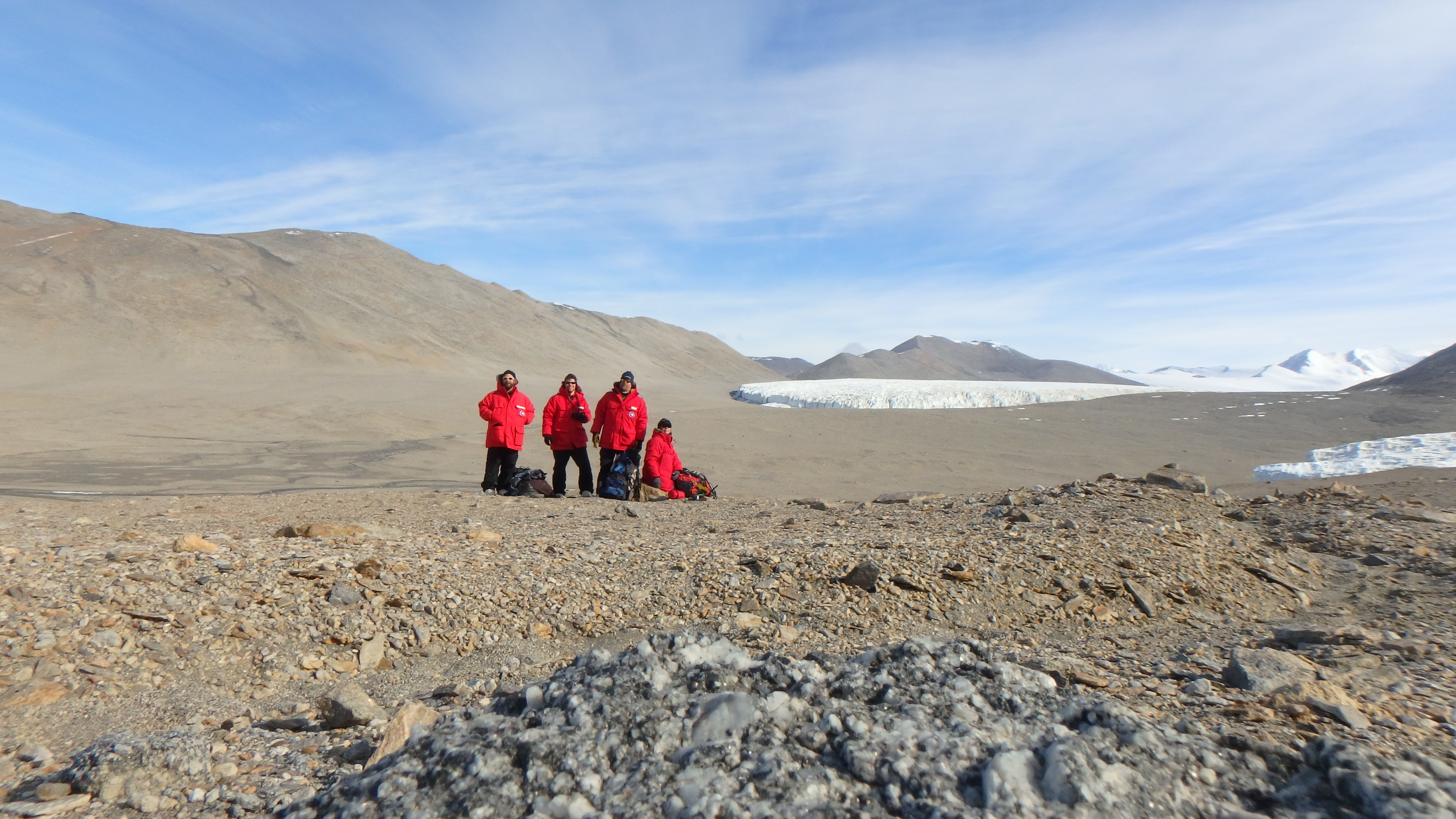 Josh Heward, Andy Thompson, Byron Adams, and Diana Wall wait for a helicopter after collecting samples in Miers Valley, Antarctica.