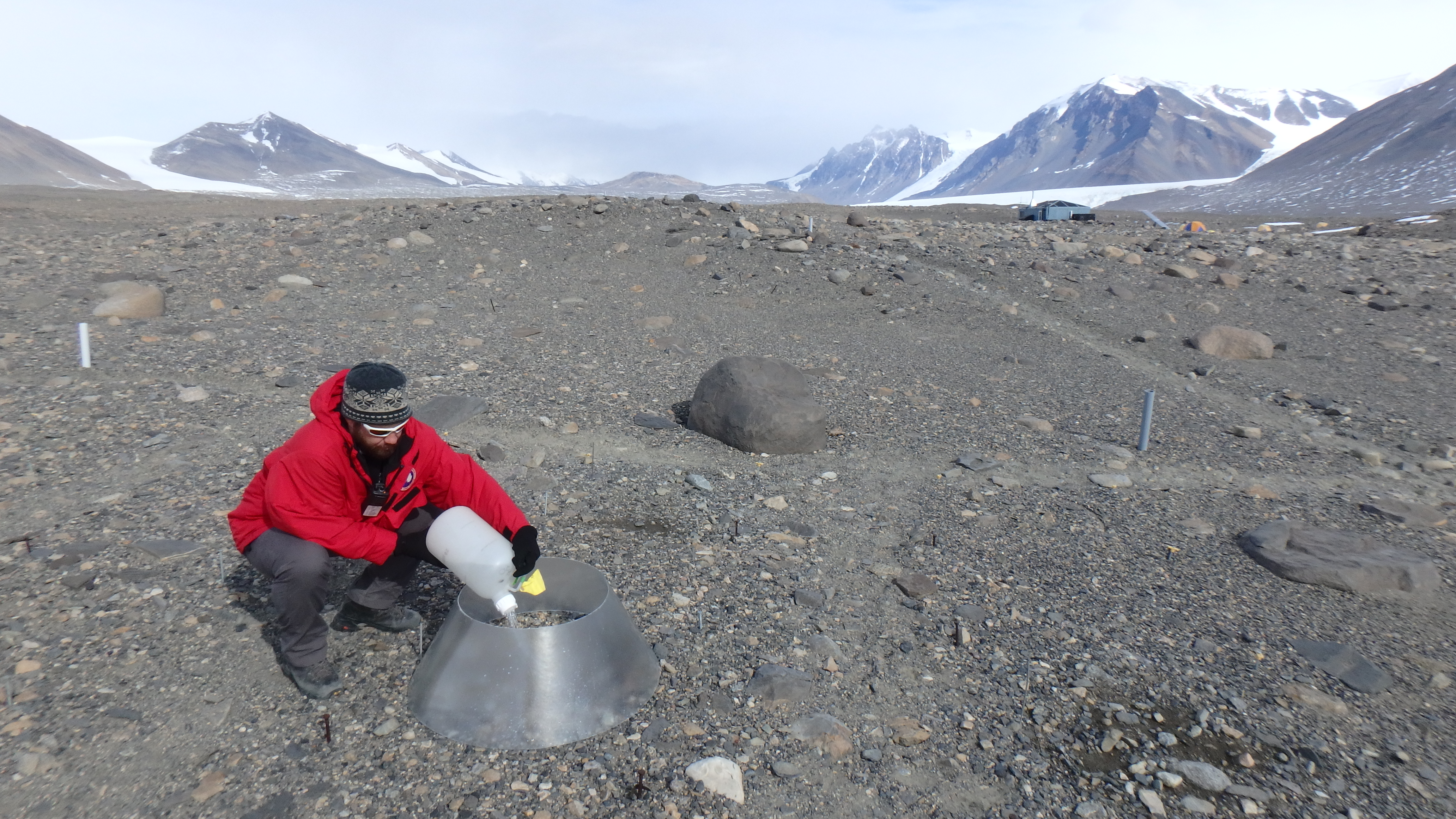 Josh Heward adds nitrogen to an experimental plot near F6 Camp in Taylor Valley, Antarctica.