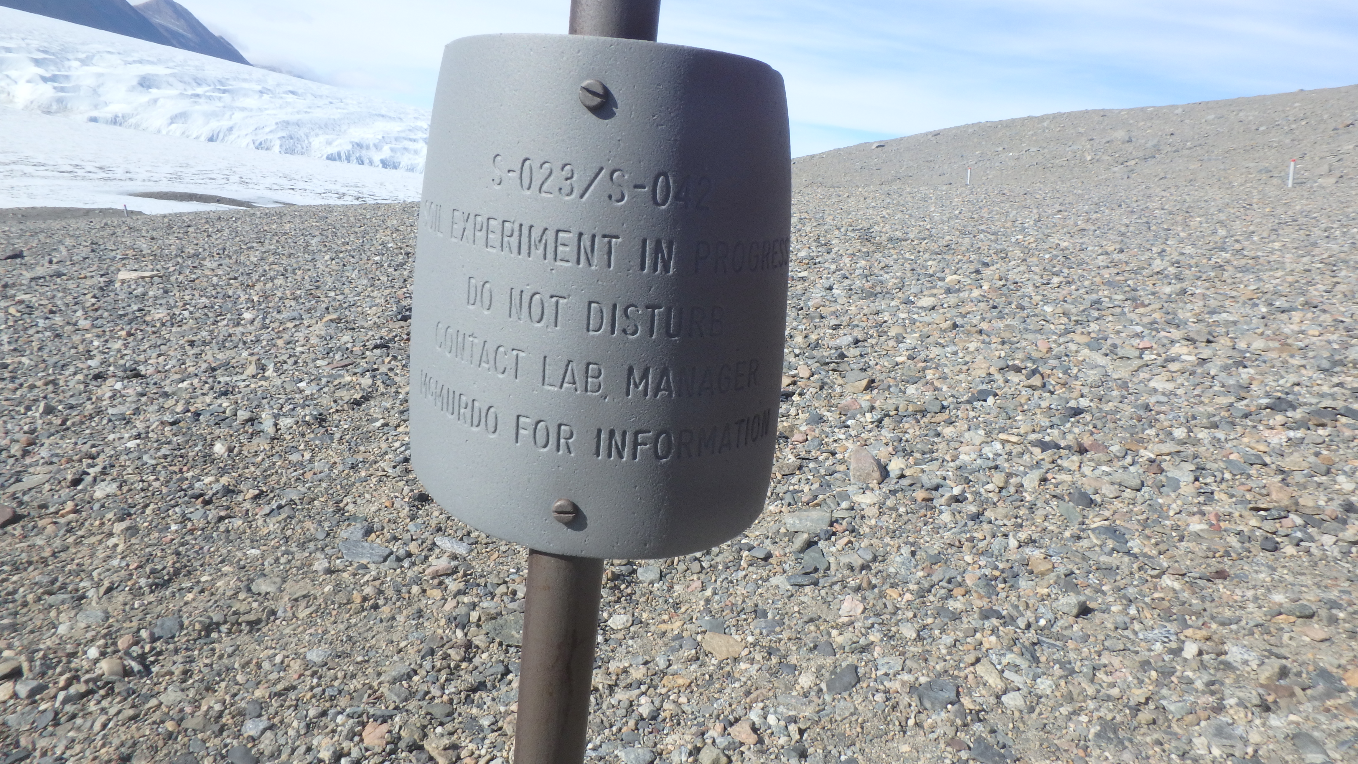 This metal sign marks an experimental plot on the south side of Lake Hoare. The sign has been severely bent by the wind and the surface has been scarred by blowing sand. Lake Hoare, Taylor Valley, Antarctica.