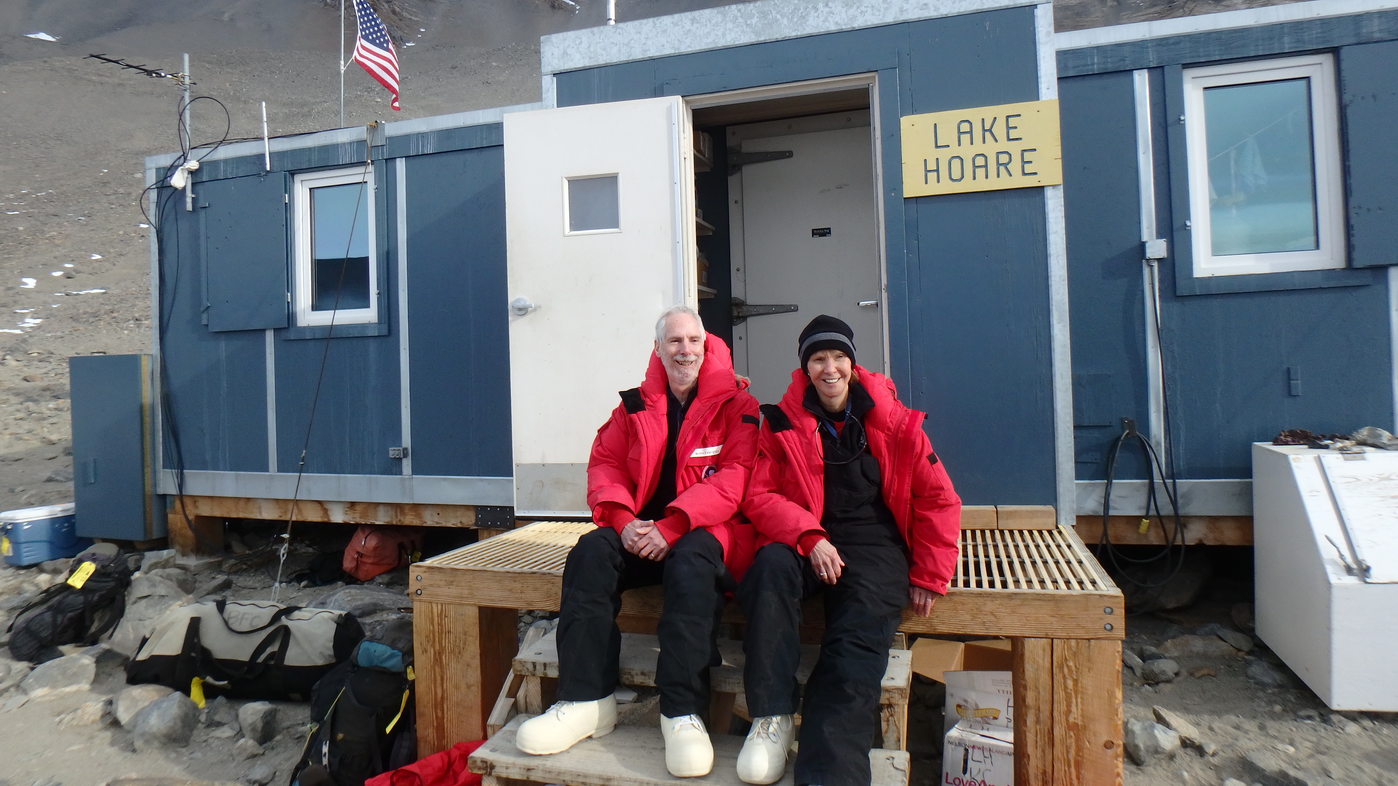 Ross Virginia and Diana Wall seated on the porch at Lake Hoare Camp during their last field season as principal investigators on the McMurdo Dry Valleys Long-term Ecological Research (LTER) project. Lake Hoare Camp, Taylor Valley, Antarctica.