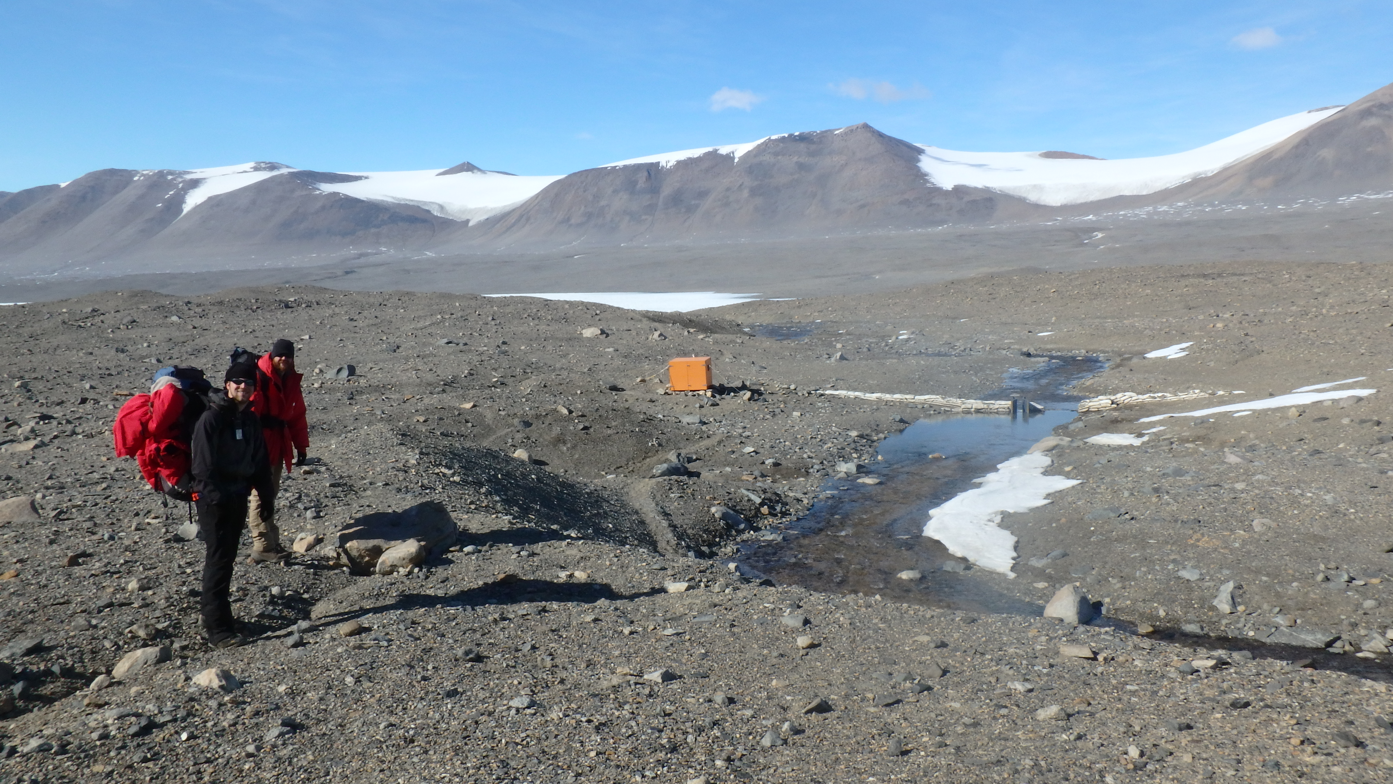 Andy Thompson and Matt Hedin stand near the Canada Stream. The stream flow sampling station is visible in the background. A small portion of the frozen Lake Fryxell is visible in the distance. Along the Canada Stream near Lake Fryxell, Taylor Valley, Antarctica.