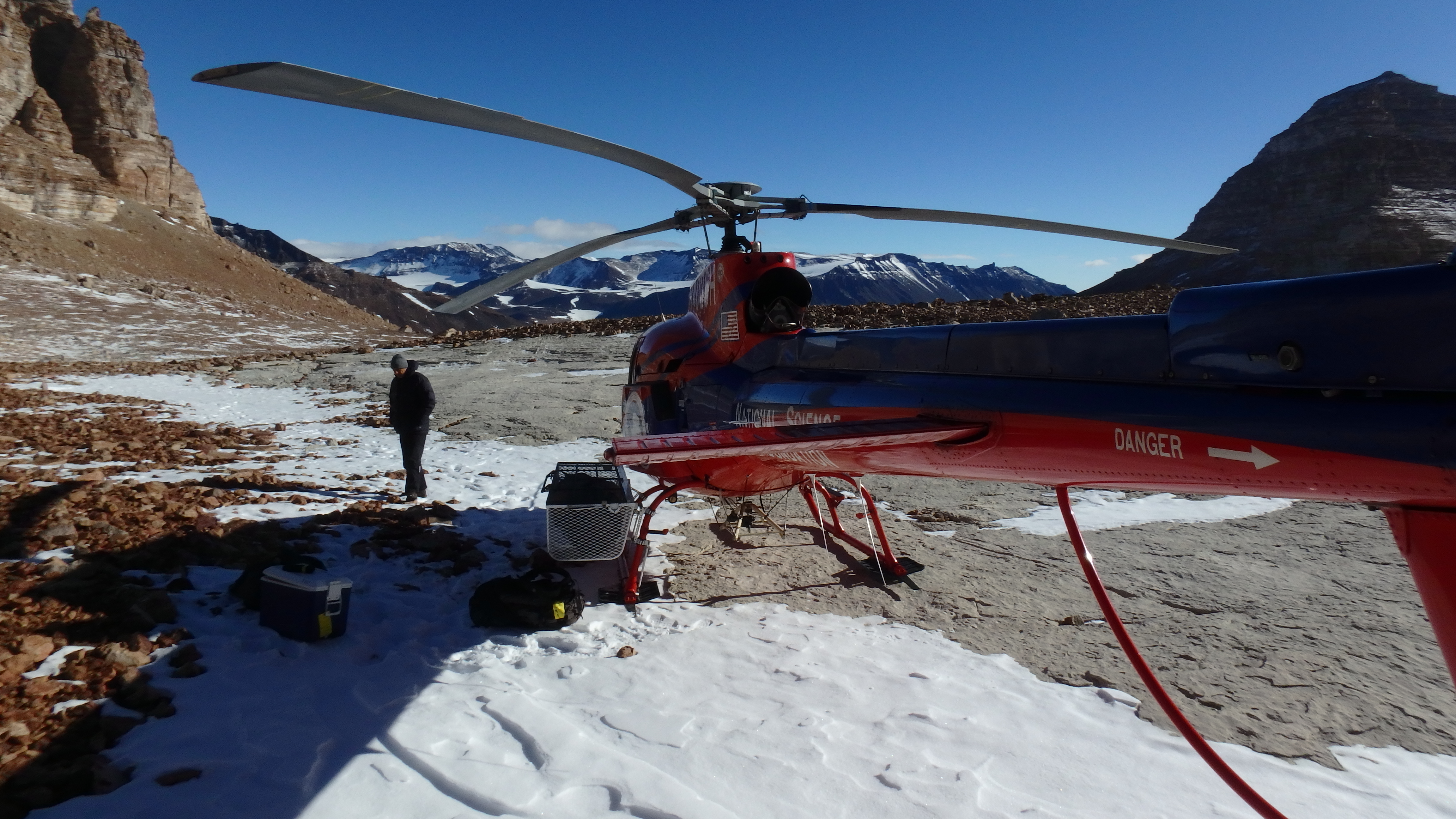 The pilot, Harlan Blake, stands next to his A-Star helicopter in Virginia Valley, Antarctica.