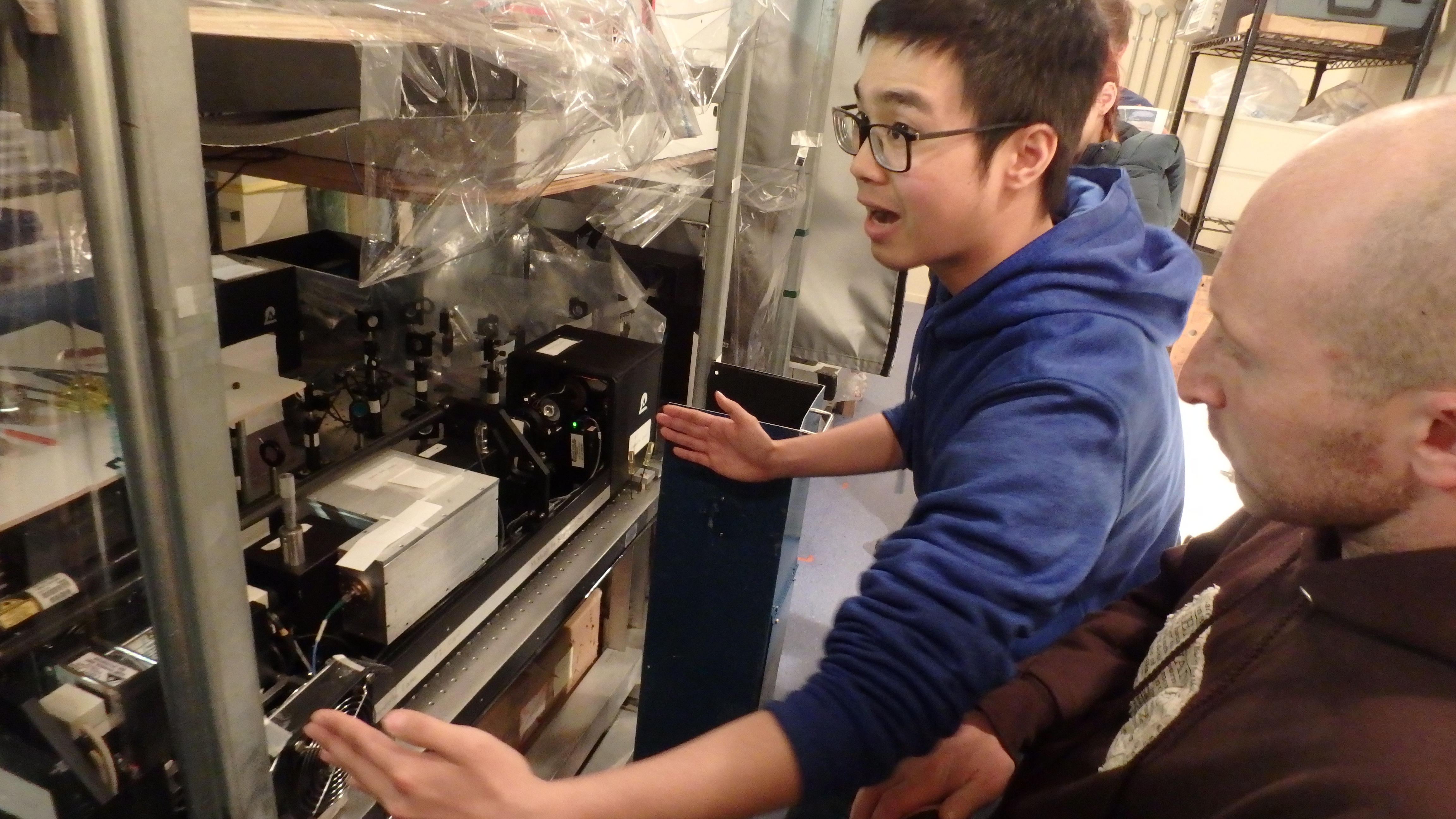 Walter Andriuzzi listens as Zhengyu (Harry) Hua explains how the LIDAR laser works. Arrival Heights, McMurdo Station, Antarctica.