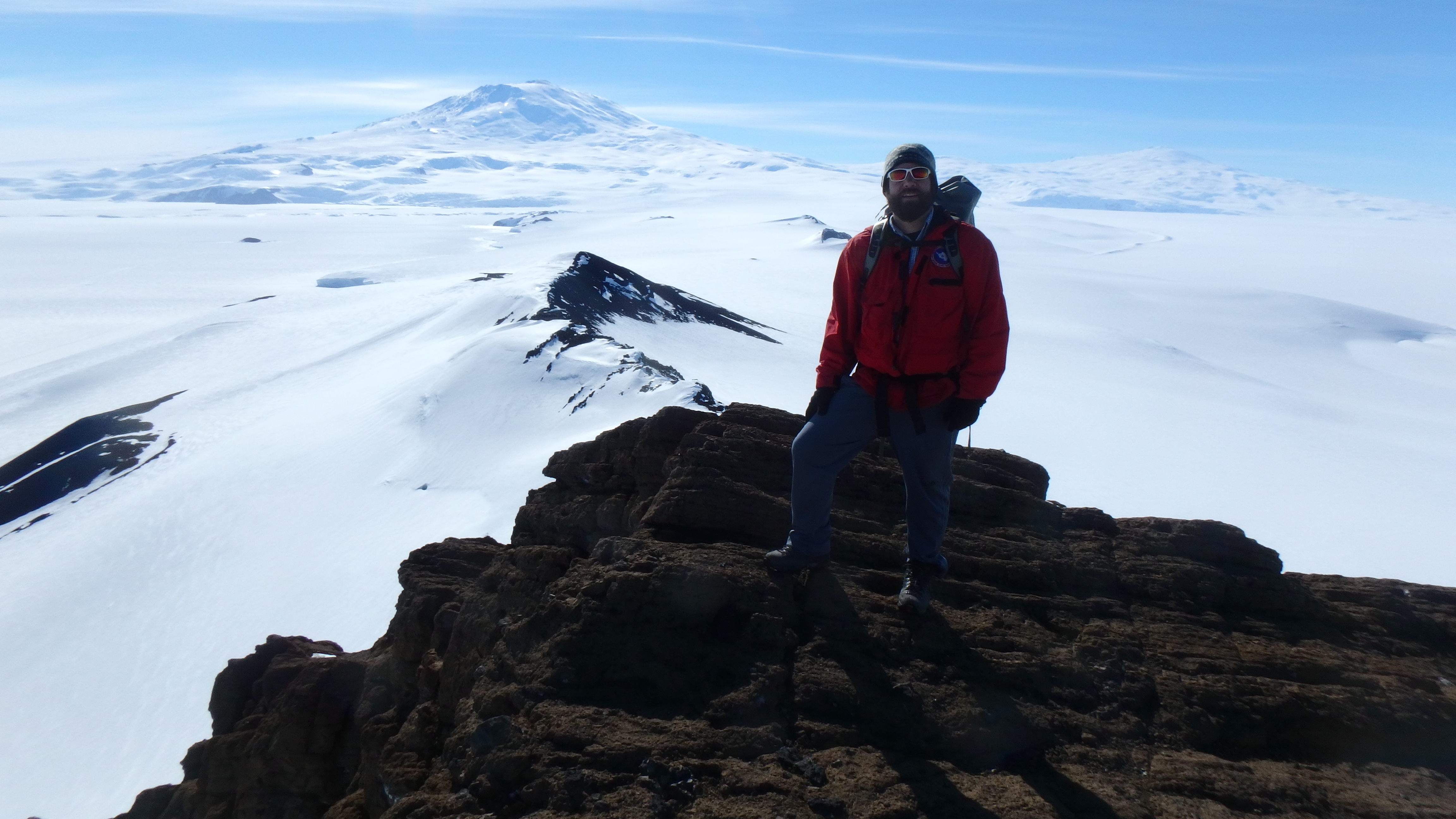 Josh Heward stands on Castle Rock with Mount Erebus in the background. Near McMurdo Station, Antarctica.