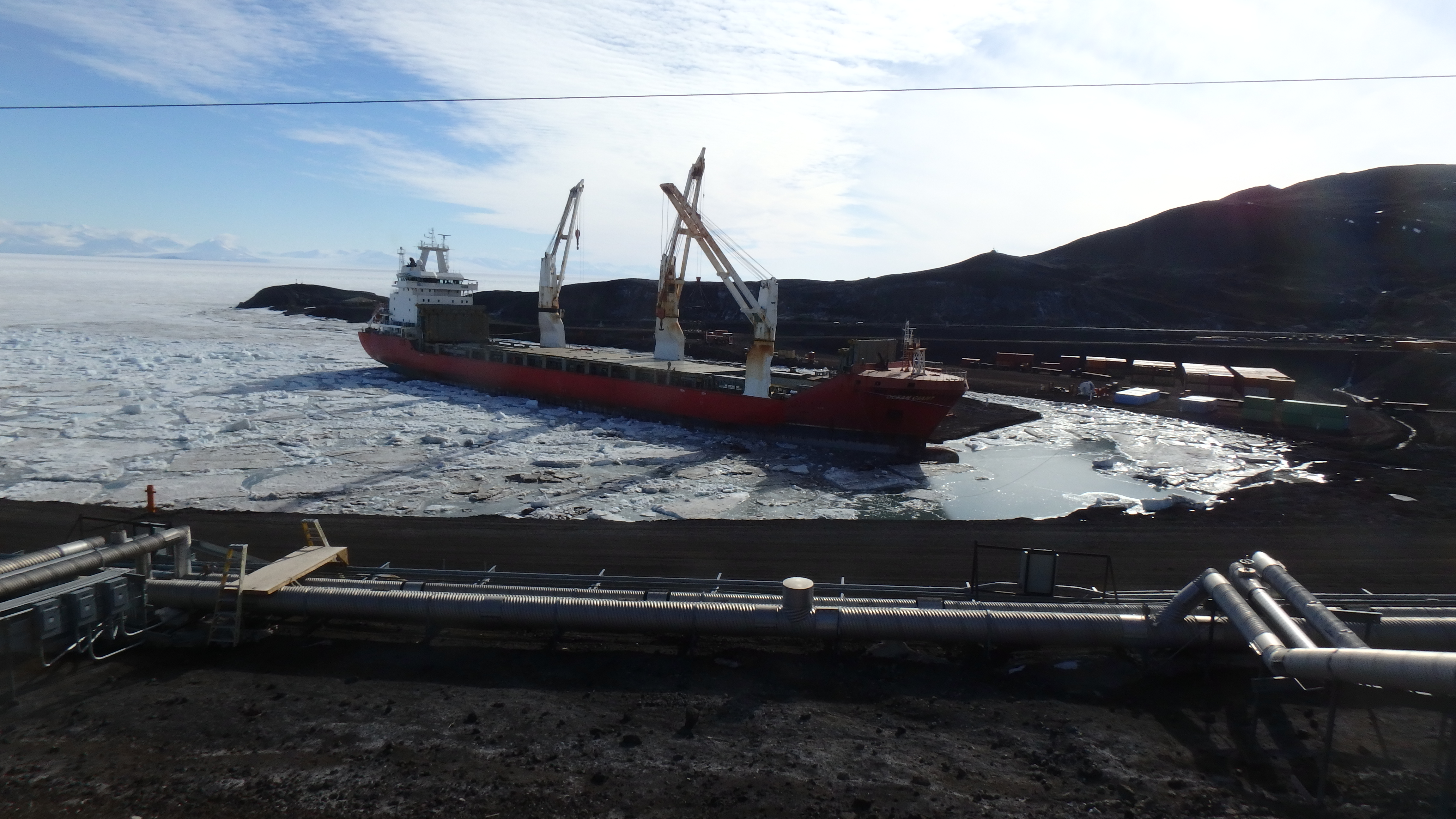 The Ocean Giant is docked at the ice pier in McMurdo Sound. This is the cargo vessel that delivers the supplies to McMurdo Station, Antarctica.