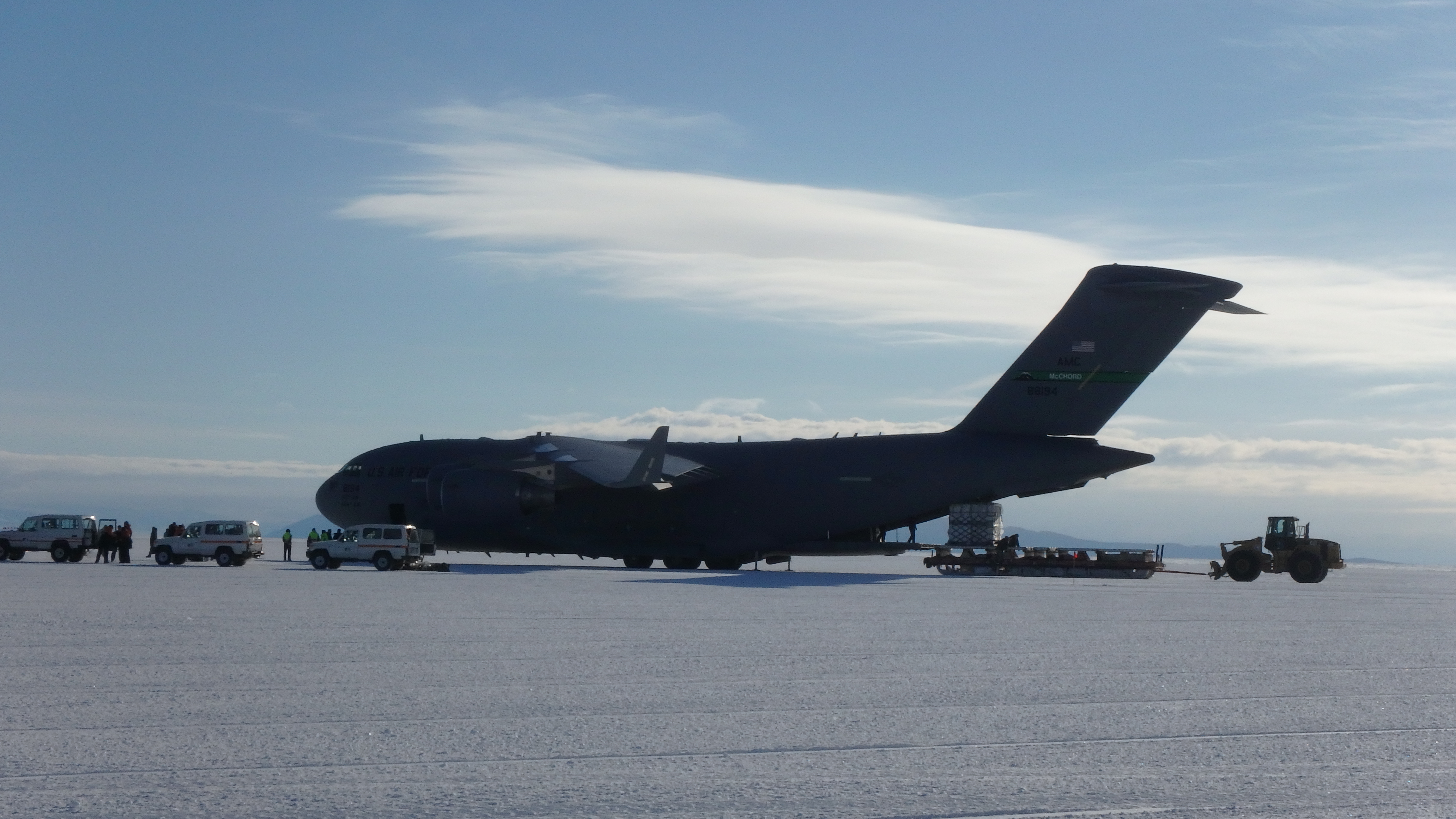 This C-17 is the team's ride back to Christchurch. This large aircraft is parked at the newly constructed Phoenix Airfield on the Ross Ice Shelf, Antarctica.