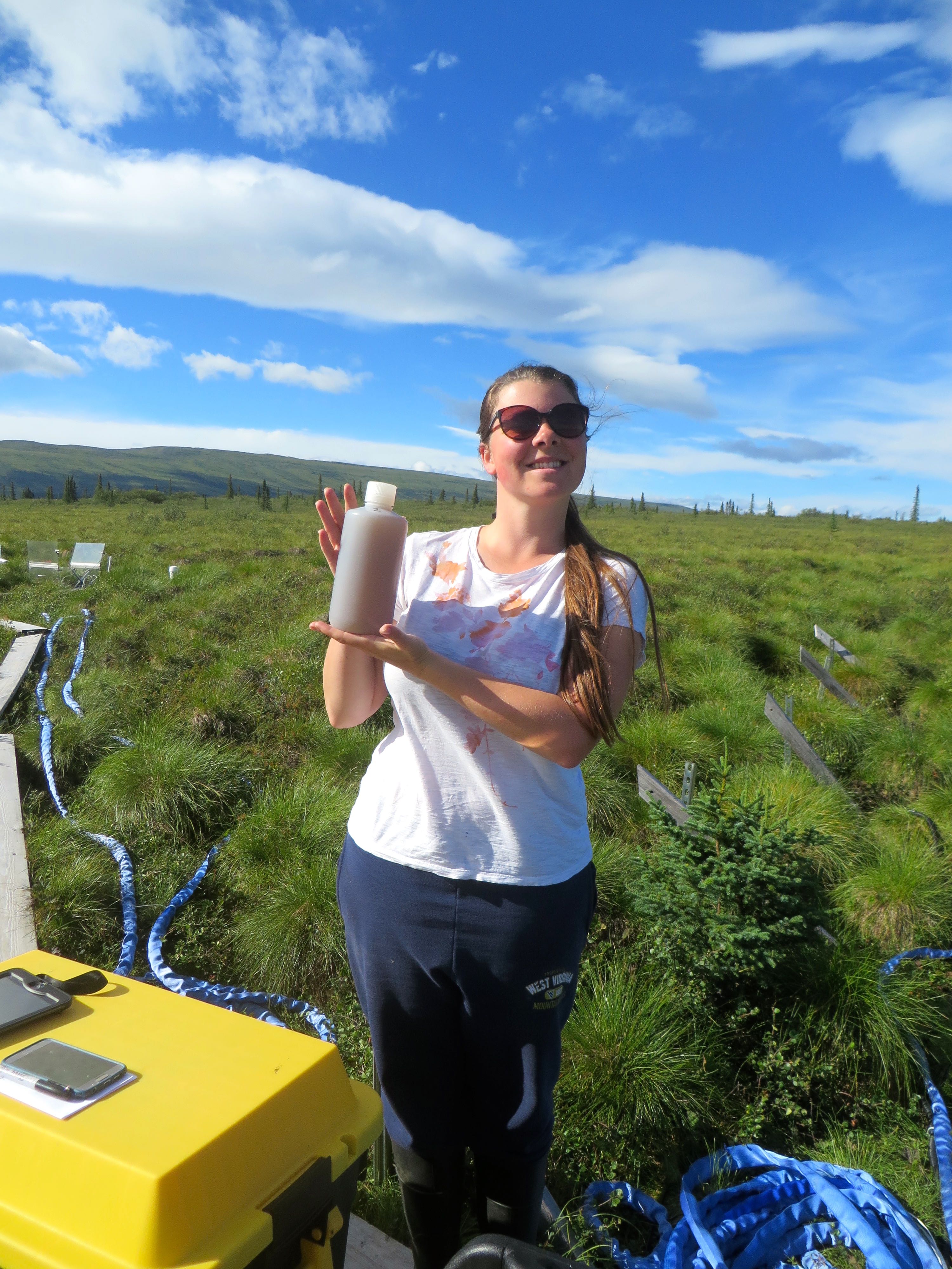 Emily Romano and her DOC water sample. At the CiPEHR site, near Healy, Alaska.