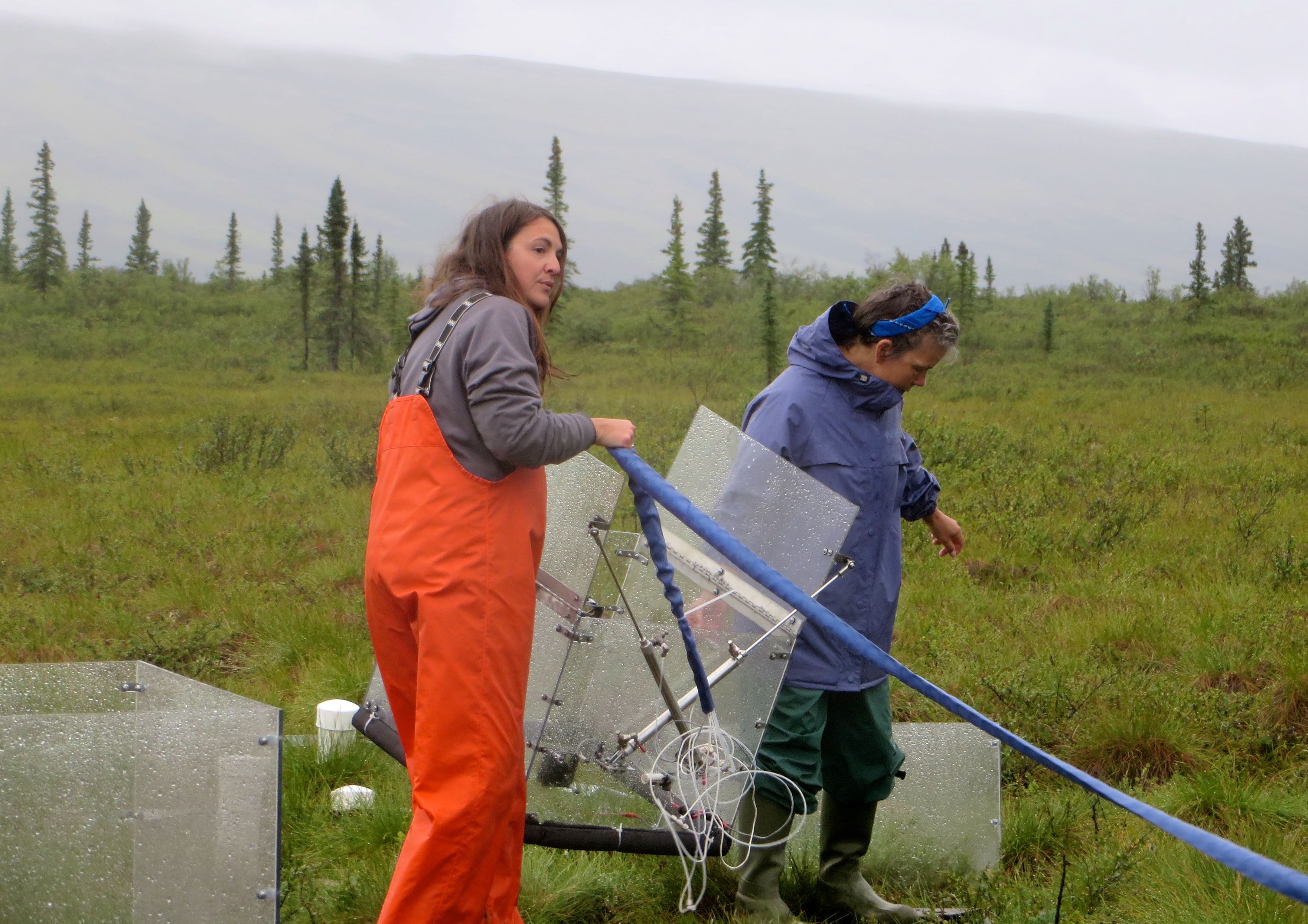 Meghan Taylor and Karen Temple Beamish carry a flux chamber to new location. At the CiPEHR site, near Healy, Alaska.