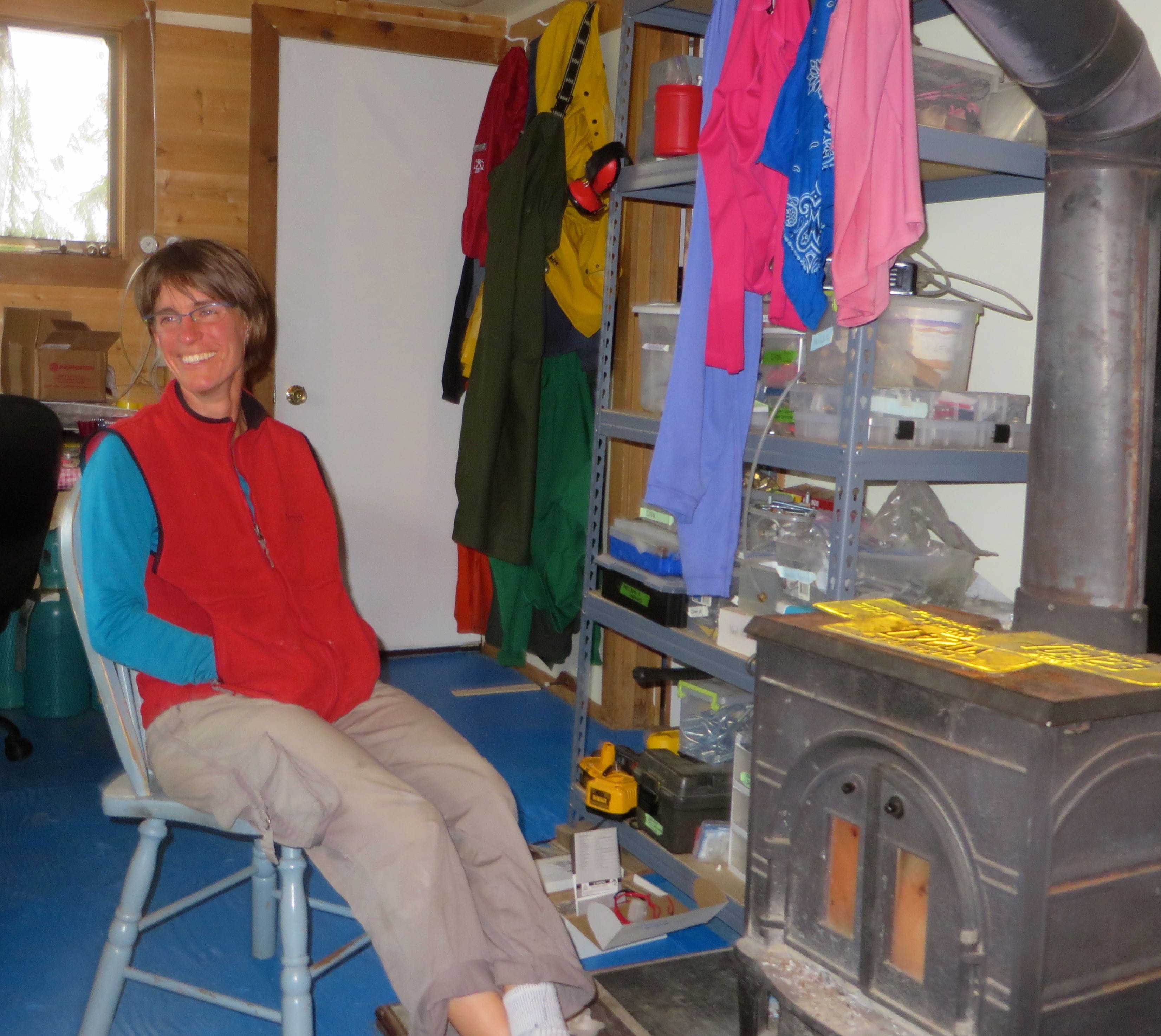 Dr. Marguerite Mauritz dries out by the fire after working in the tundra. At the CiPEHR site, near Healy, Alaska.