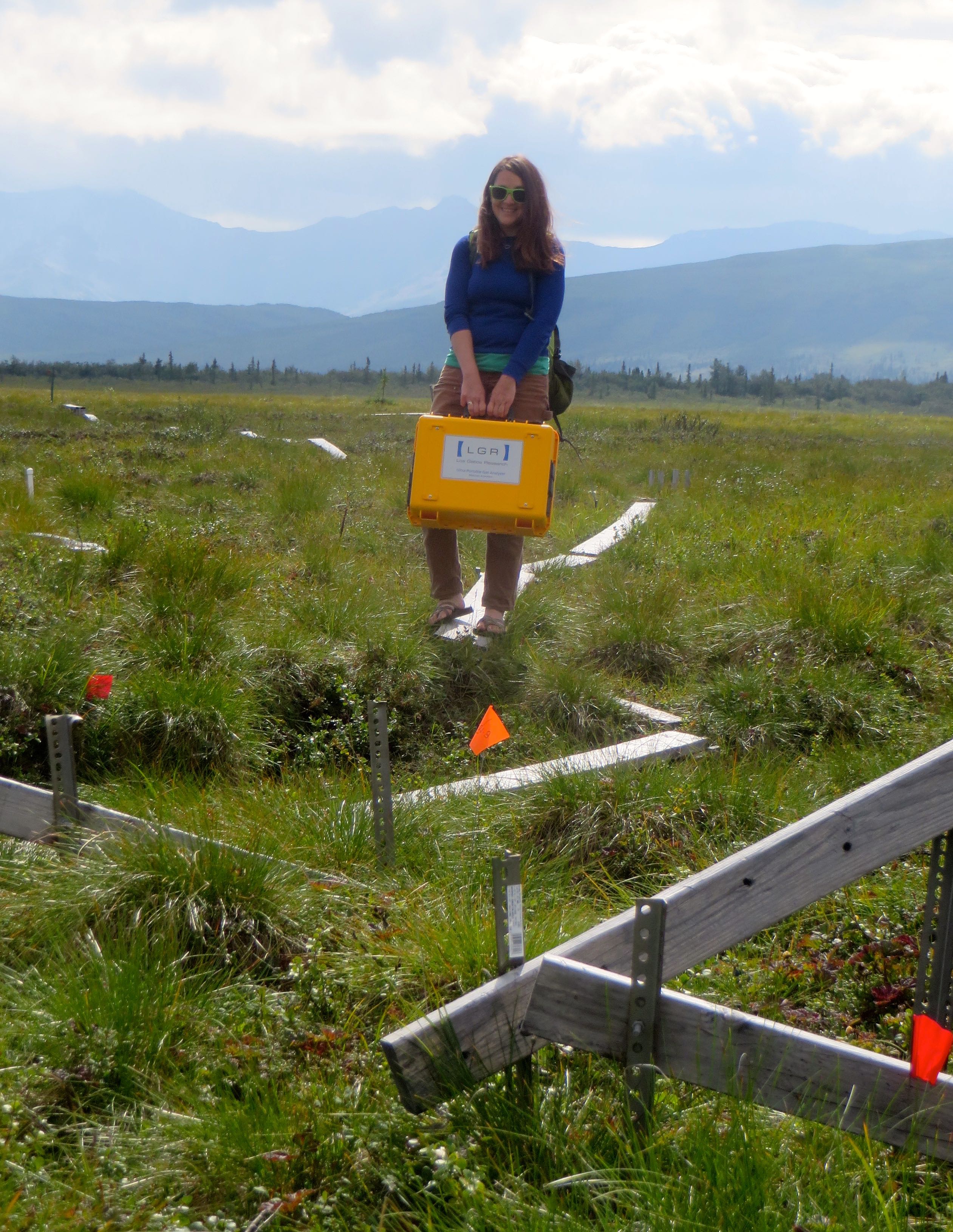 Meghan Taylor hauls the methane analyzer. At the CiPEHR site, near Healy, Alaska.