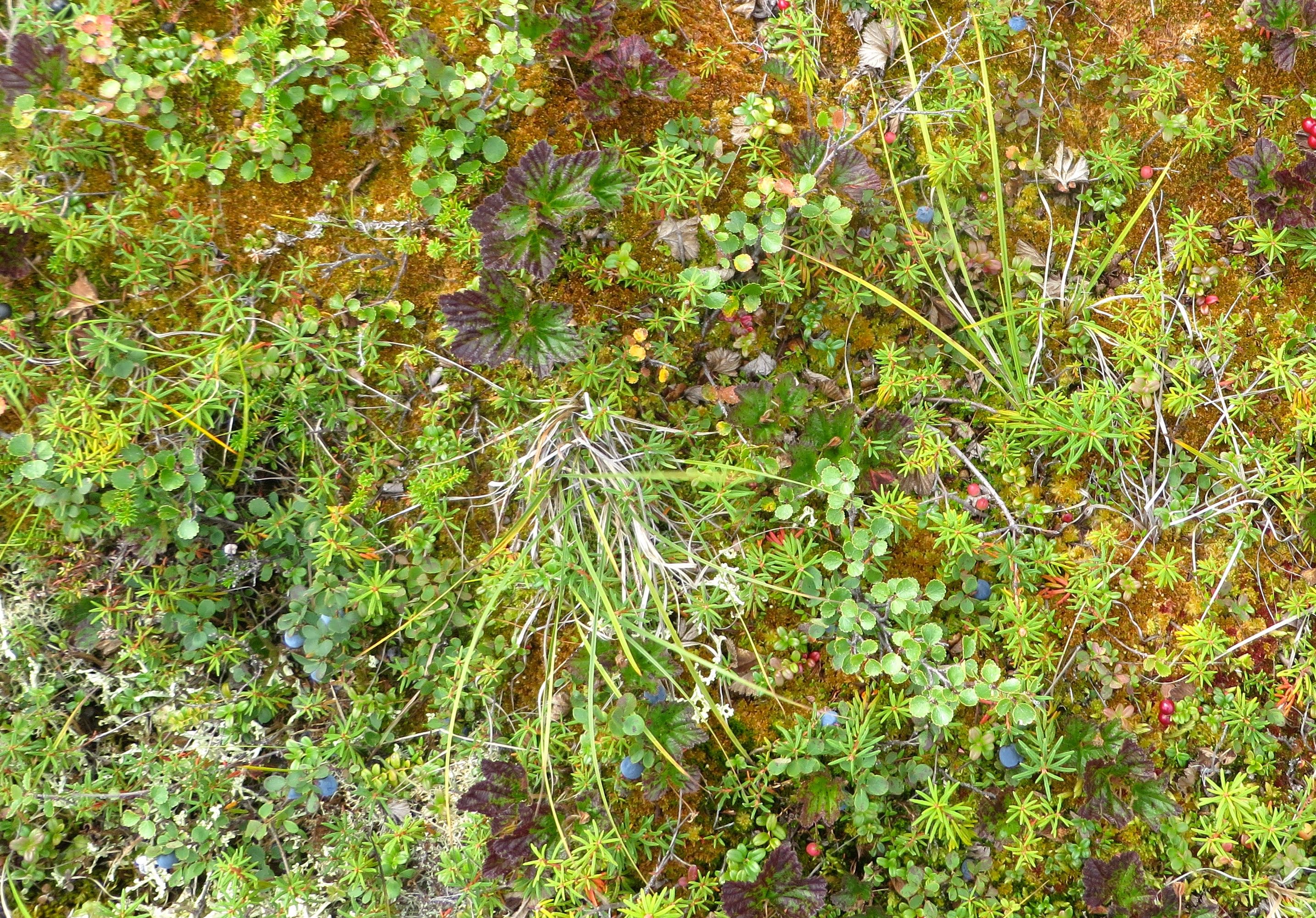 A close-up view of moss on the tundra – the moss is the shorter, darker green. At the CiPEHR site, near Healy, Alaska.