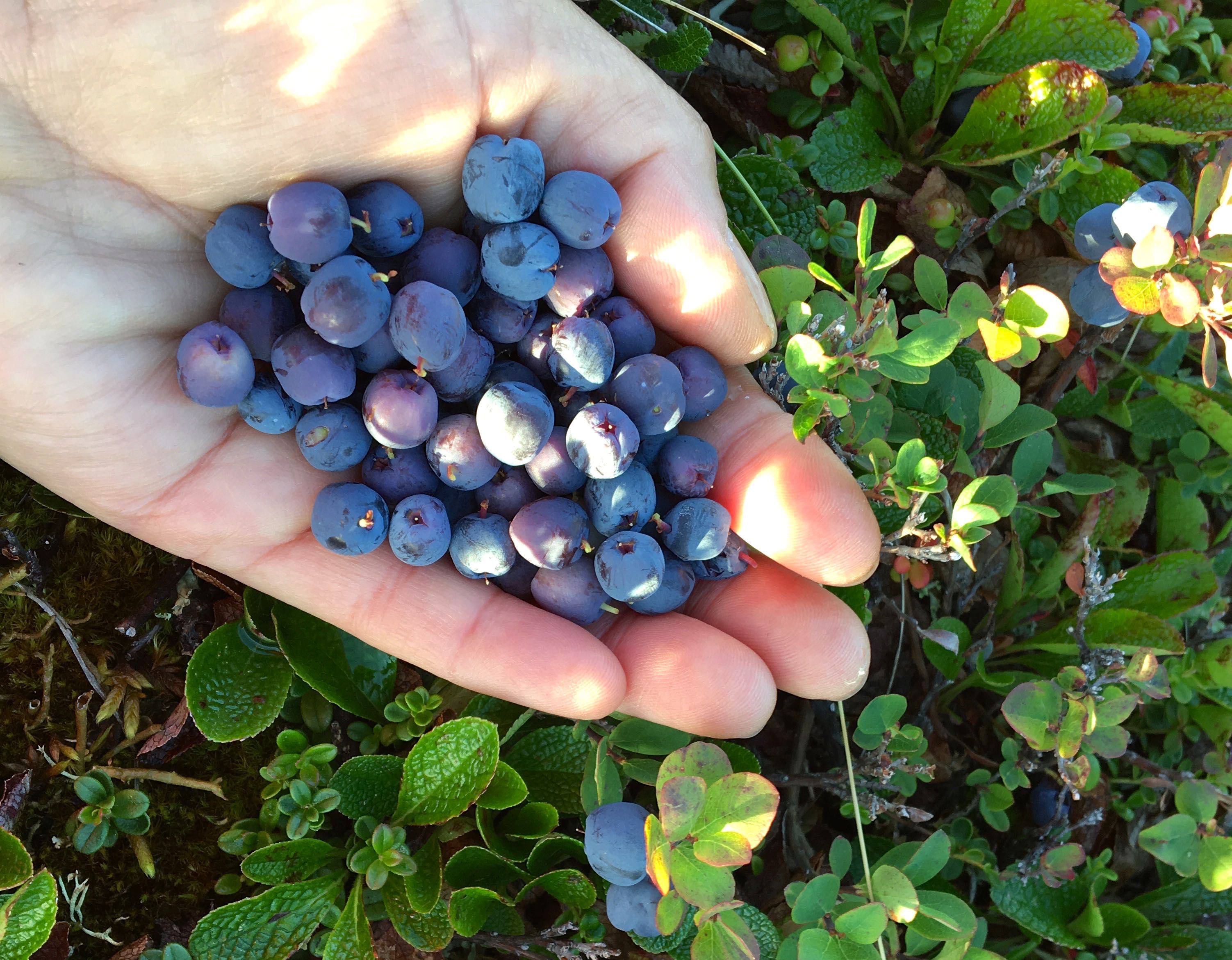 Karen Temple Beamish holds a handful of blueberries that were picked along the Denali Highway, Alaska.
