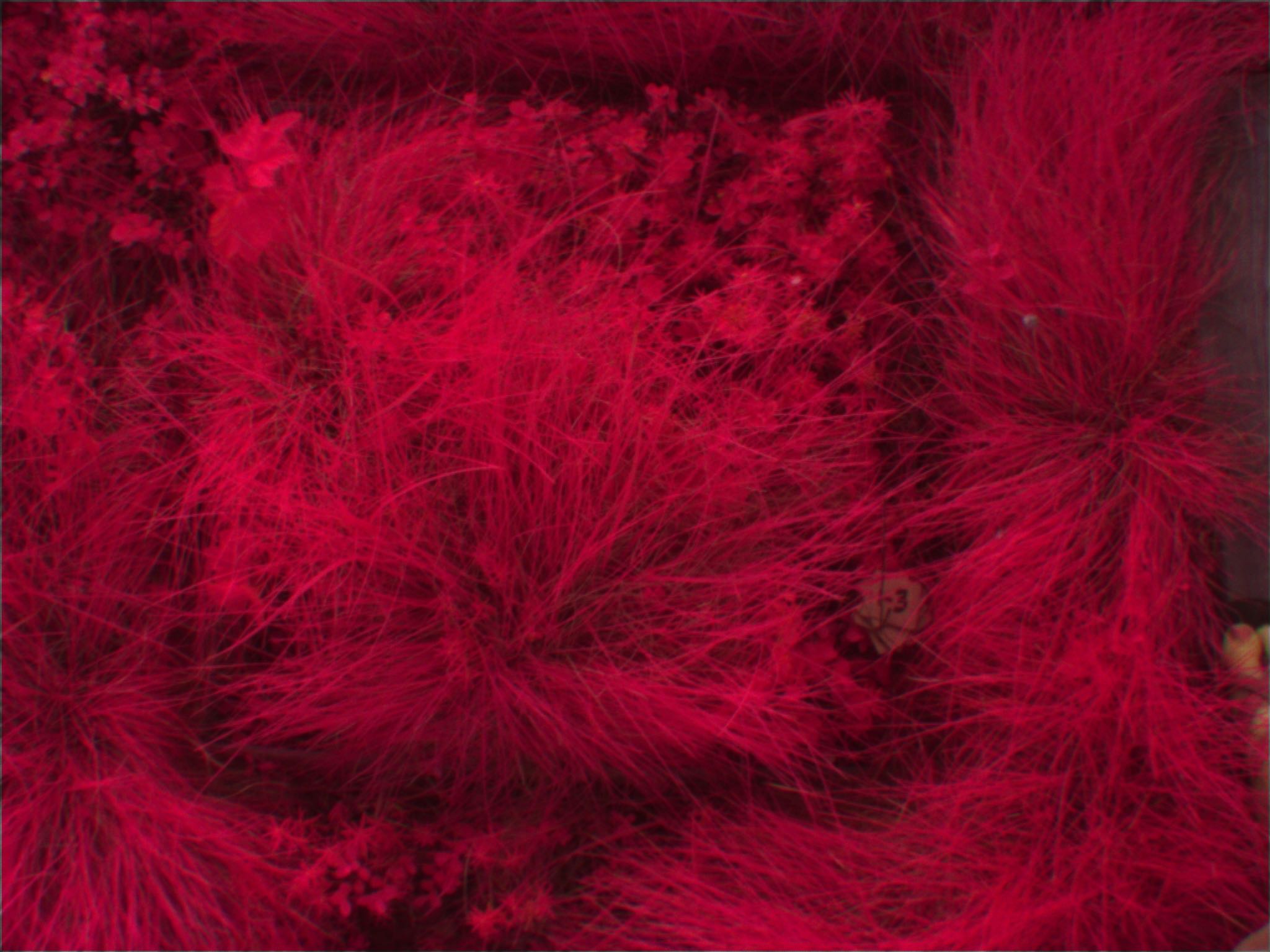 What a research plot looks like through the Normalized Difference Vegetation Index (NDVI) camera. The infrared image measures the amount of live vegetation in an area. At the CiPEHR site, near Healy, Alaska.