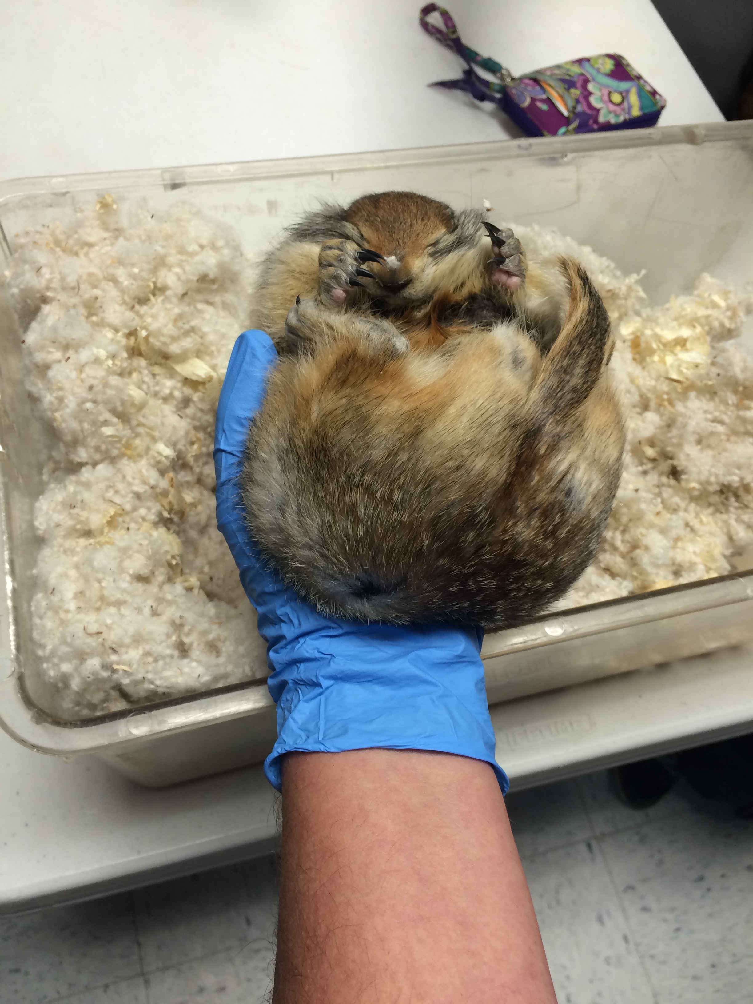 A hibernating Arctic ground squirrel is held above her cage full of insulating material. University of Alaska Museum of the North, Fairbanks, Alaska.