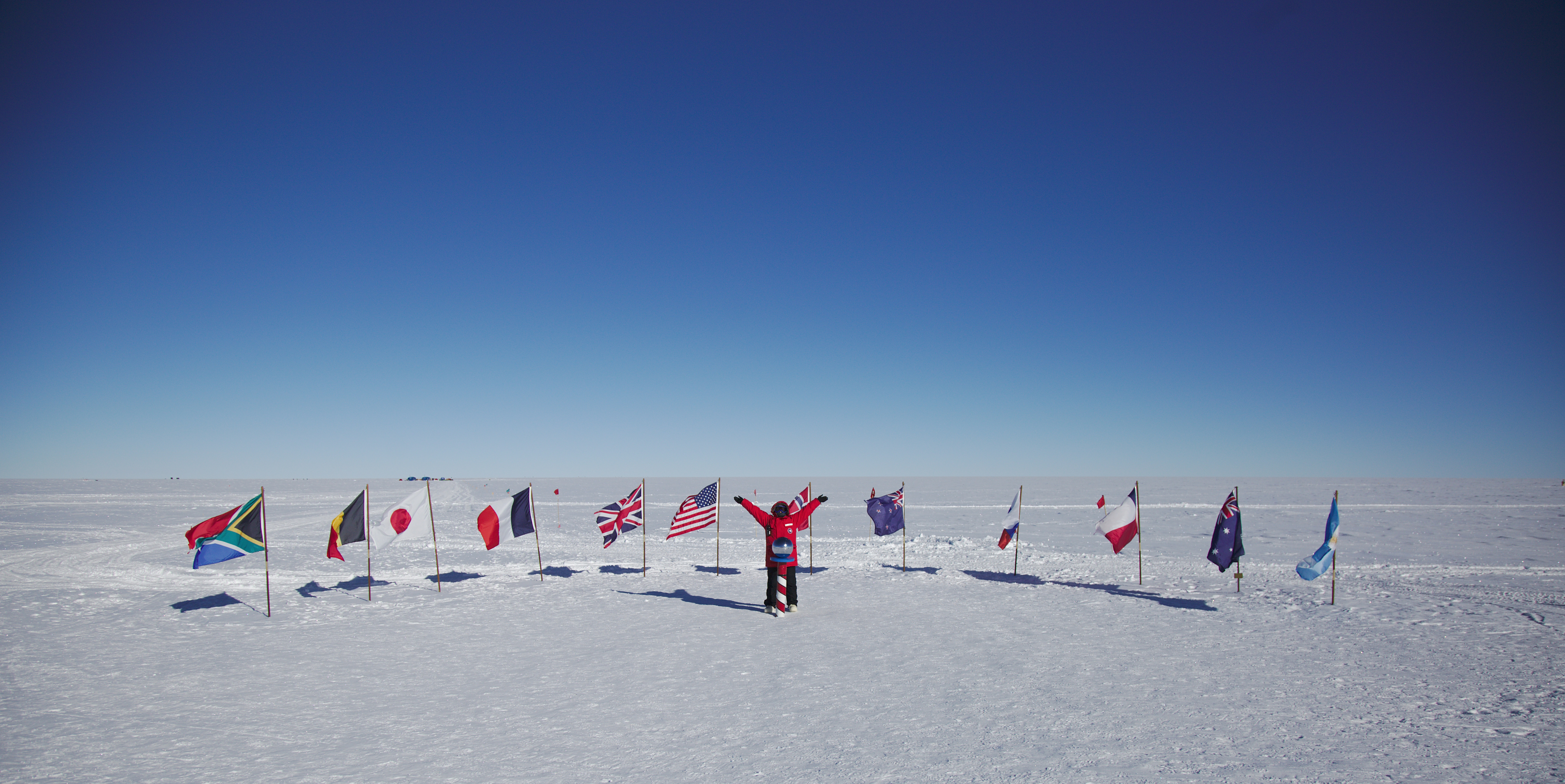 Kate Miller at the Ceremonial South Pole. In the middle there is the official marker and surrounding it are the 12 flags representing the 12 countries that signed the original Antarctic Treaty. Amundsen-Scott South Pole Station, Antarctica.