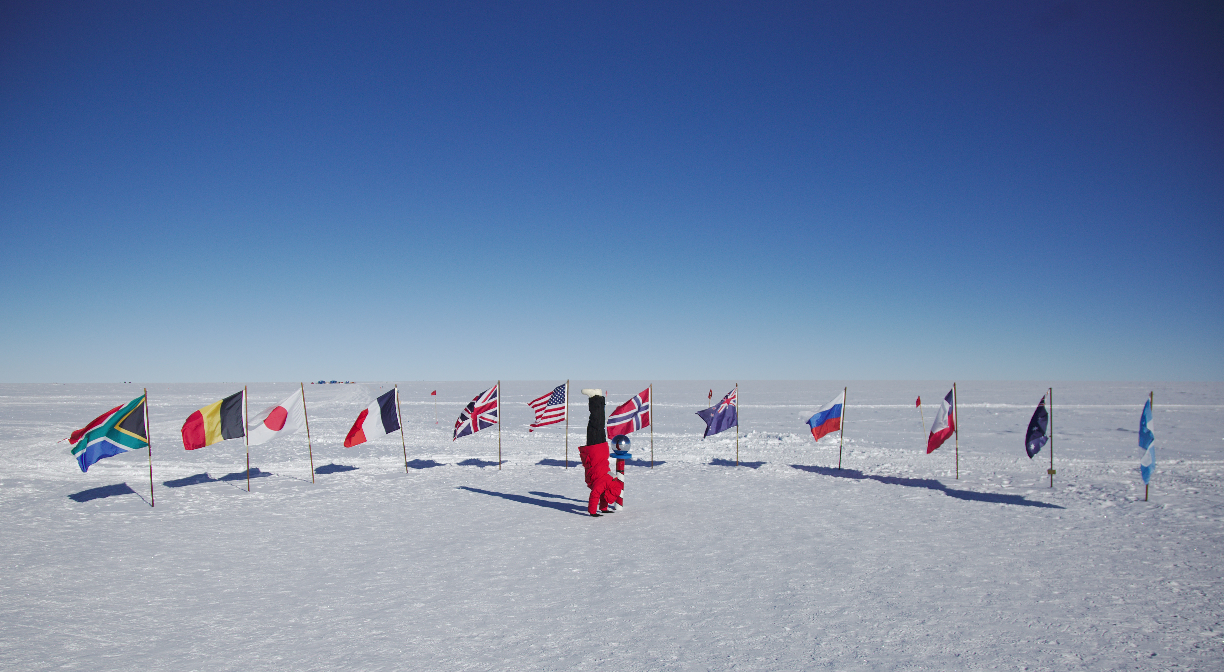 Kate Miller does a handstand at the Ceremonial South Pole. Amundsen-Scott South Pole Station, Antarctica.
