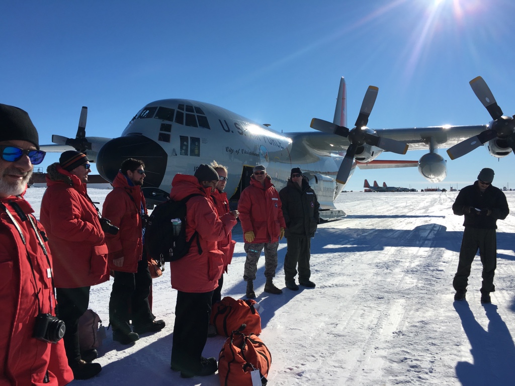 The team gets briefed before boarding their flight from McMurdo Station to Amundsen-Scott South Pole Station, Antarctica.