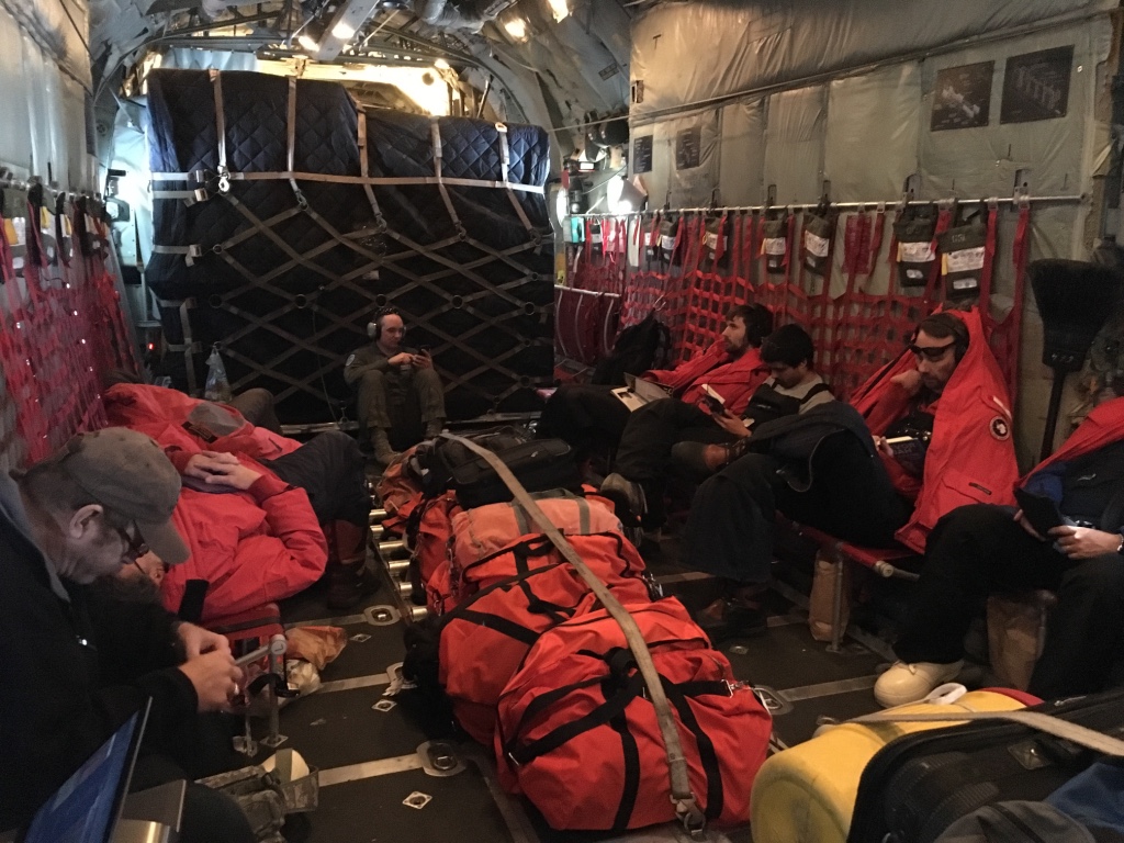 Inside the LC-130, everyone sat in pull-down canvas nets and their bags were strapped down in the middle. On the flight from Christchurch, New Zealand to McMurdo Station, Antarctica.