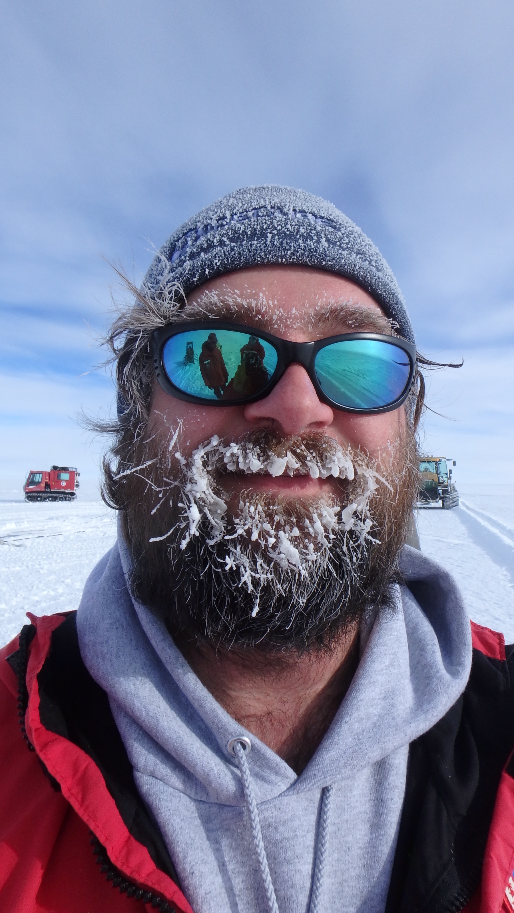 Taken right after the team finished trenching, James Casey's beard shows how moisture will freeze at the South Pole. Amundsen-Scott South Pole Station, Antarctica.