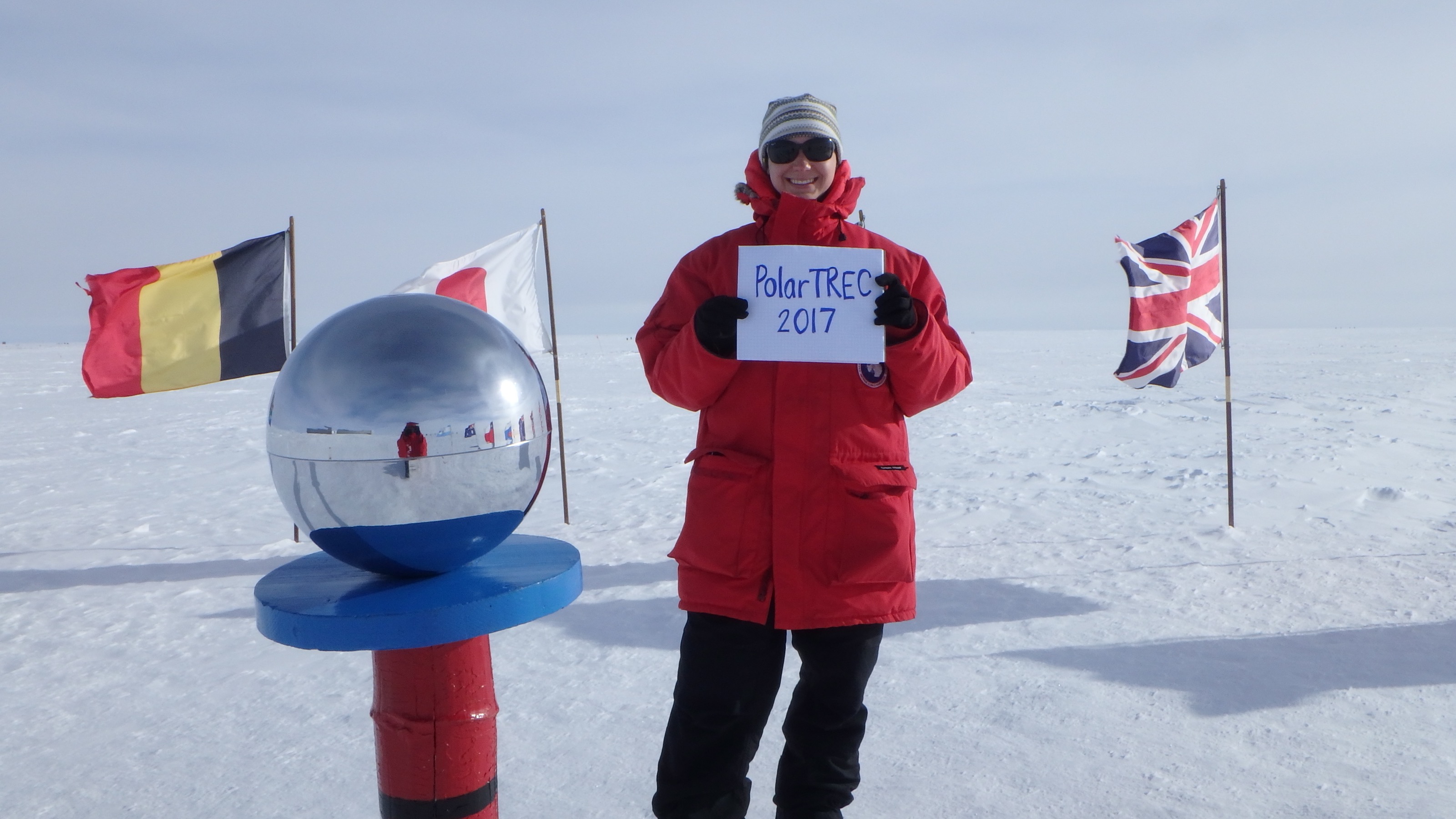 Kate Miller supports PolarTREC at the Ceremonial South Pole at the Amundsen-Scott South Pole Station, Antarctica.