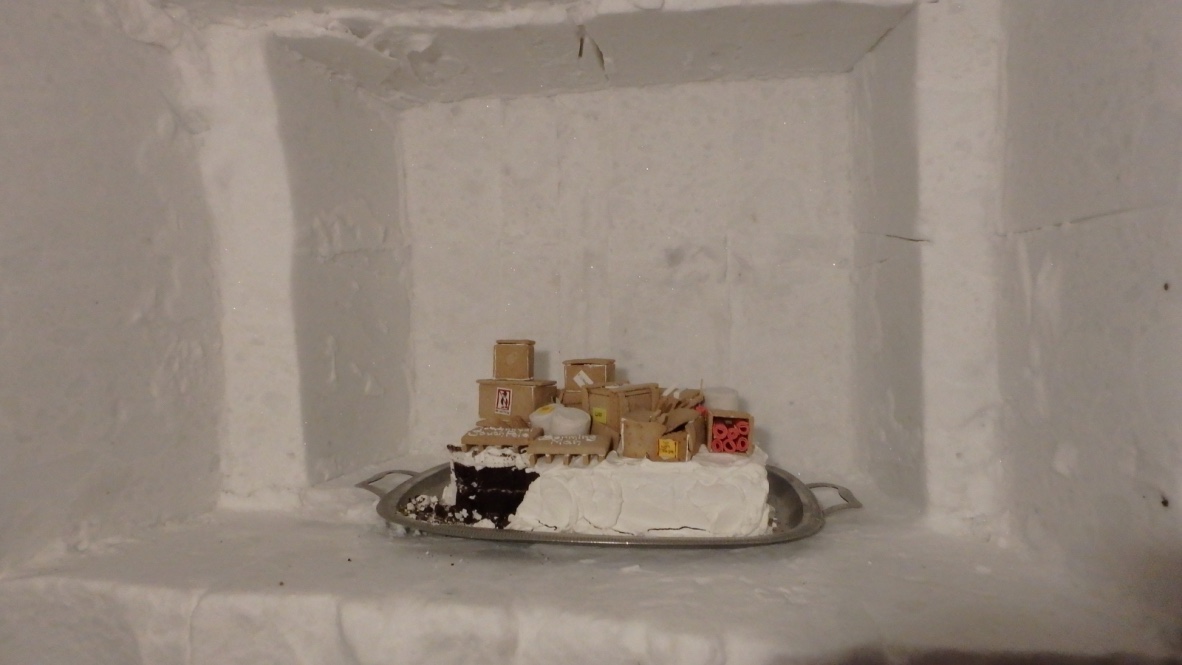 Kate Miller: "During some special event here, there happened to be a professional cake decorator who made this gorgeous cake. It was so well-done, no one wanted to eat it. Thus, was put in this shrine in the Tunnels where it is frozen solid. As a funny twist, since it's been in the Tunnels people have started eating the cake." Amundsen-Scott South Pole Station, Antarctica.