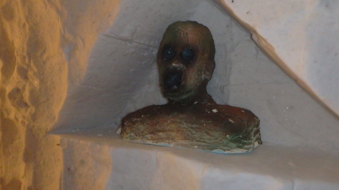 Kate Miller: "This shrine features a (pretty creepy) sculpture. This head used to sit in one of the side tunnels which are much darker and creepier than the main one. Imagine turning on the lights and seeing this!" Amundsen-Scott South Pole Station, Antarctica.
