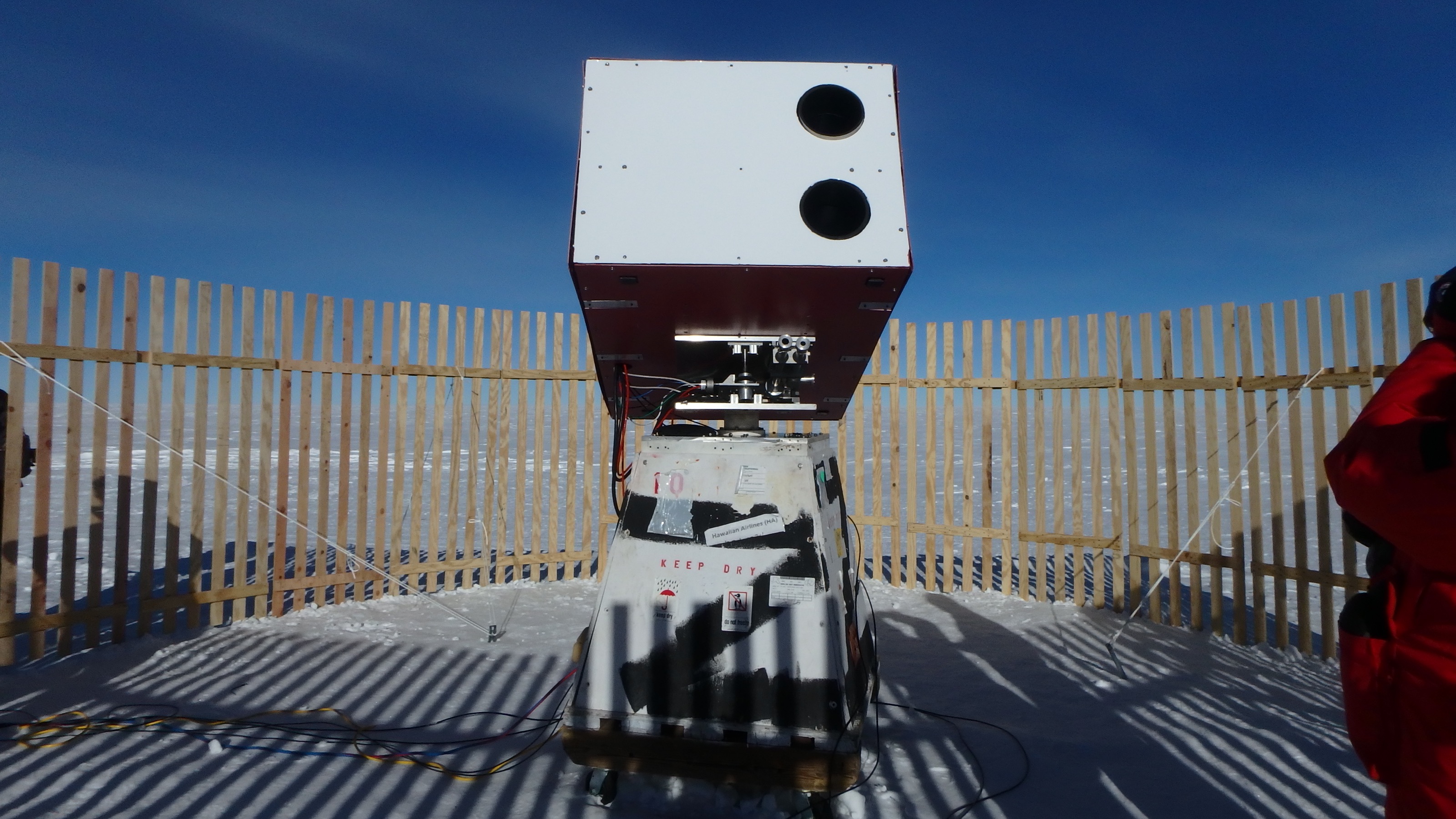 The Solar Telescope at the South Pole Solar Observatory looks at the sun in an effort to better understand and predict solar flares and coronal mass ejections. The picket fence surrounding this telescope minimizes the incoming wind. Amundsen-Scott South Pole Station, Antarctica.