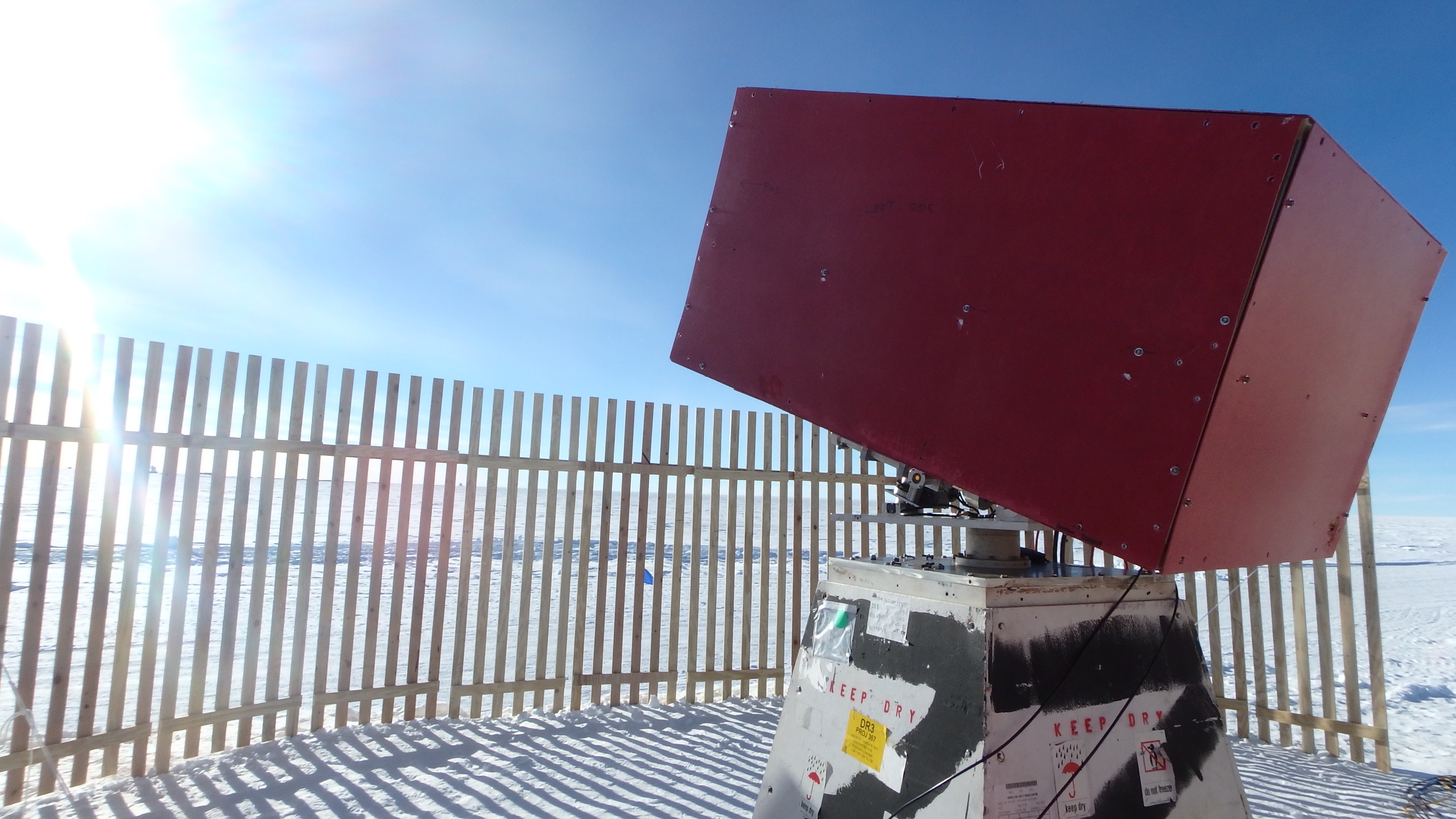 The Solar Telescope at the South Pole Solar Observatory looks at the sun in an effort to better understand and predict solar flares and coronal mass ejections. The picket fence surrounding this telescope minimizes the incoming wind. Amundsen-Scott South Pole Station, Antarctica.