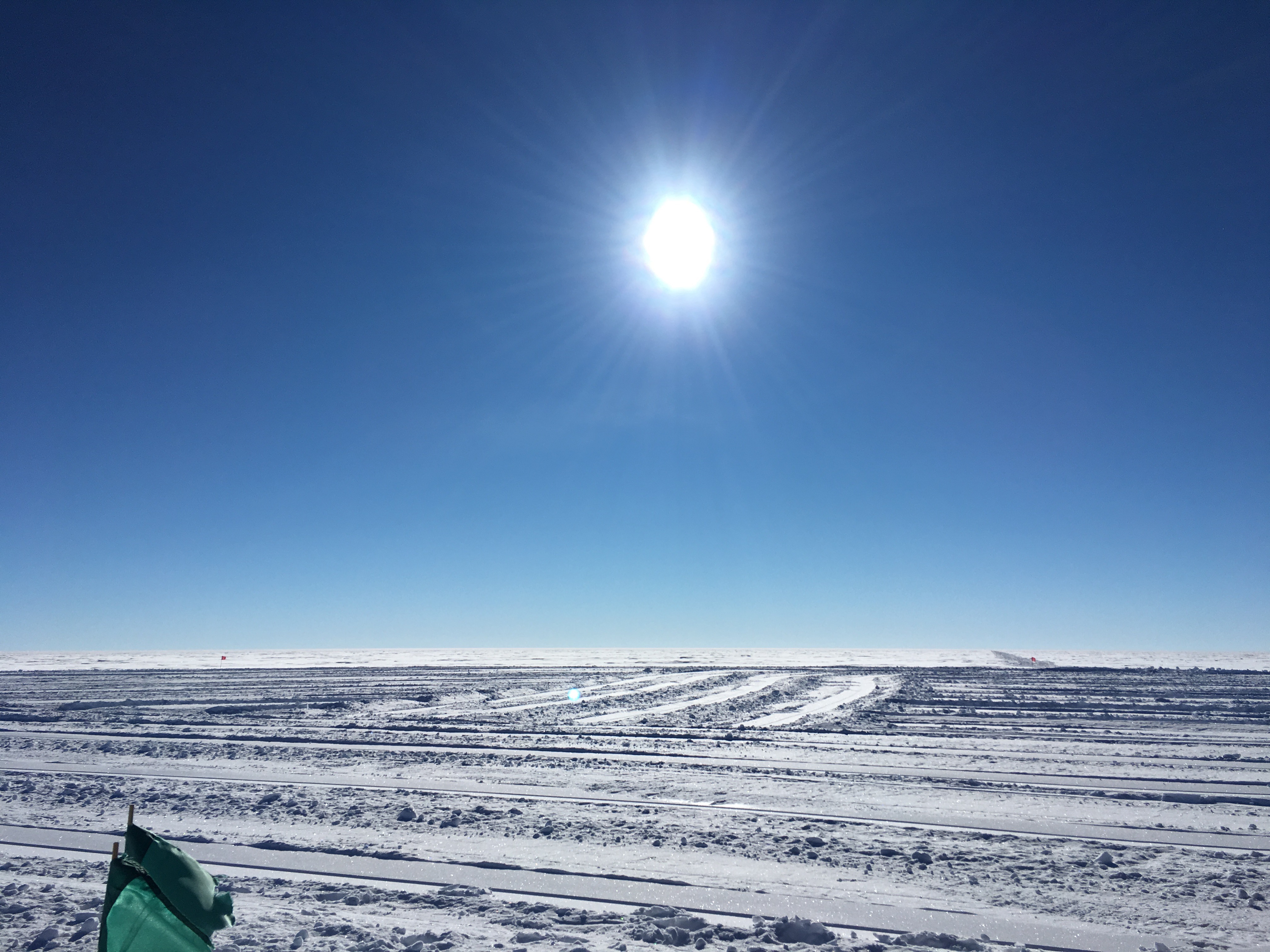The sun sits low in the sky at the Amundsen-Scott South Pole Station, Antarctica.