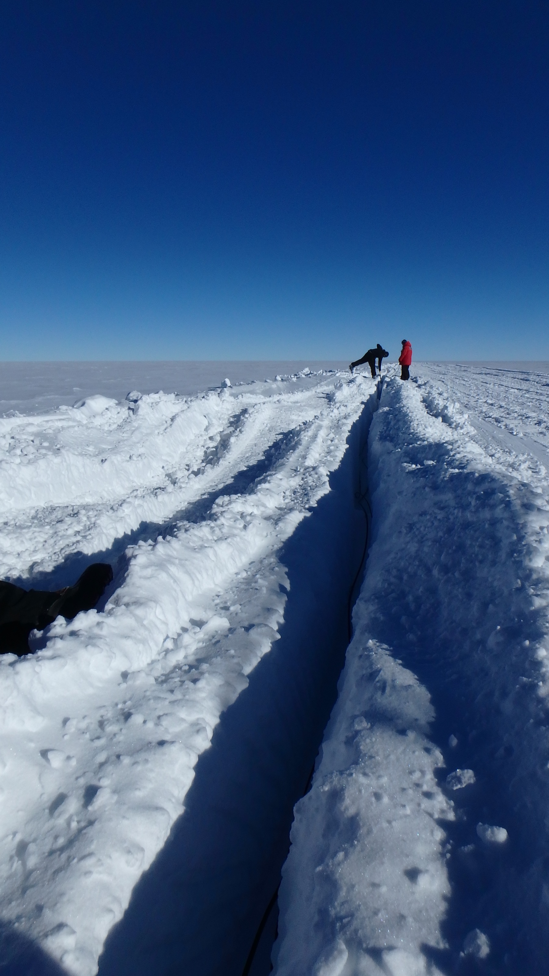 Mike DuVernois and Michael Larson lay the power cable and fiber optic cable into this trench that goes on for over a mile. In the 2017-18 season these cables will be ready to go for the deployment of three more Askaryan Radio Array stations. Amundsen-Scott South Pole Station, Antarctica.