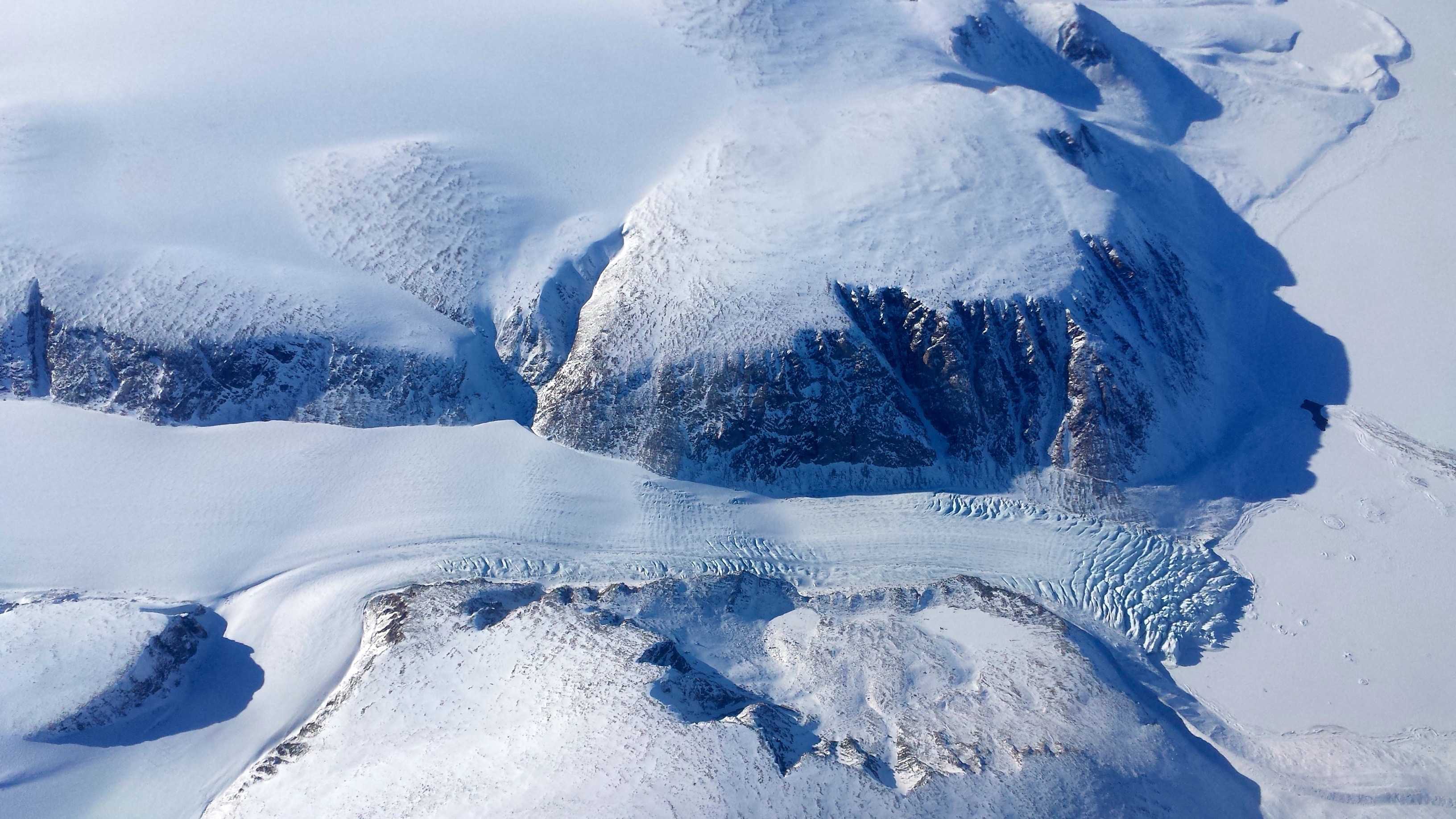 Kelly McCarthy: "As a tidewater glacier in northern Greenland empties into the ocean, a distinct change in the density of crevasses and fractured ice is observed closer to the terminus." Aboard the WP-3D Orion over the Greenland Ice Sheet.