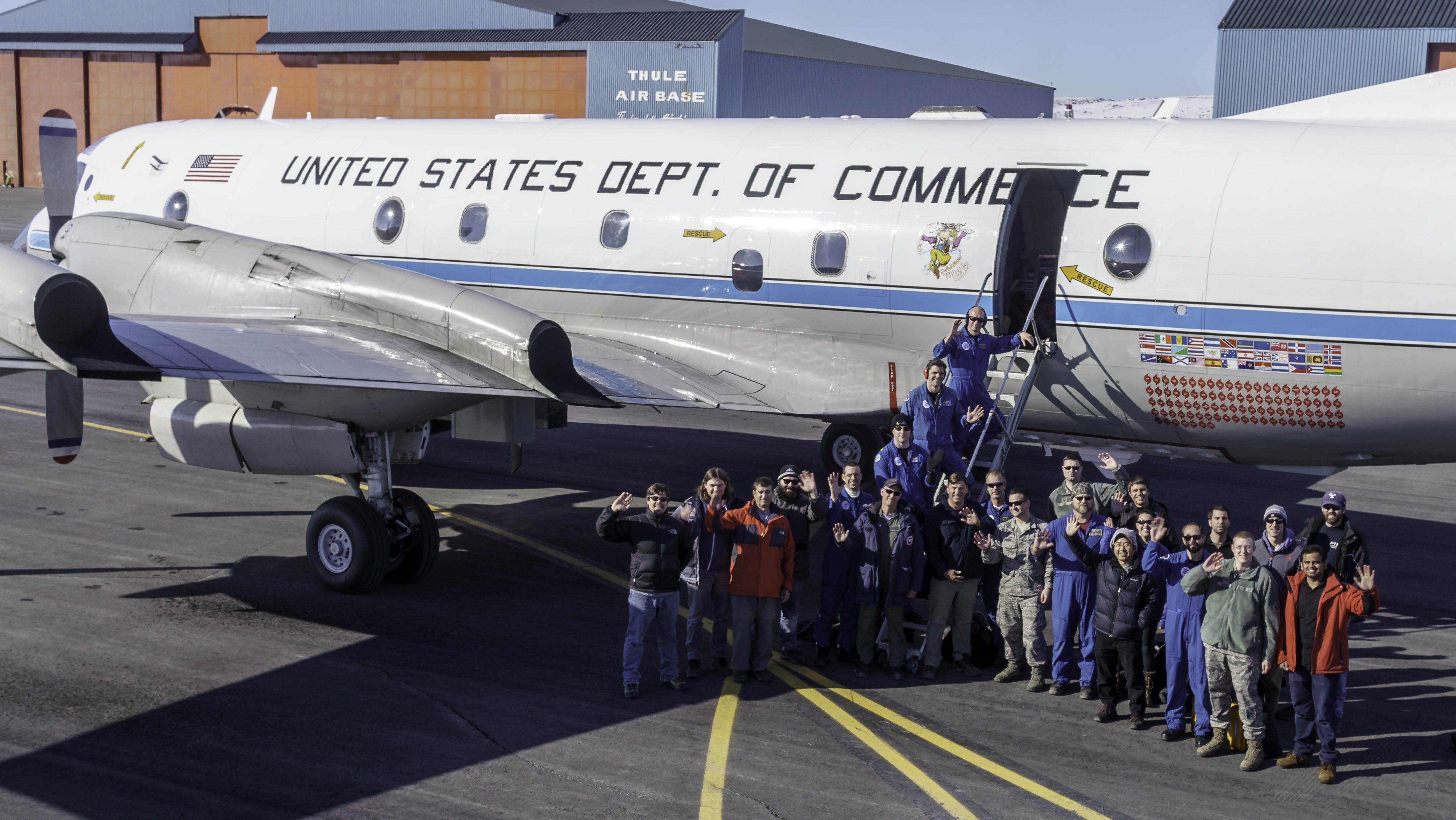 The NASA Operation IceBridge science team, NOAA Flight crew, and Thule Air Base US Air Force liaisons pose with "Miss Piggy," the WP-3D Orion used during science flights during the NASA Operation IceBridge 2016 Arctic spring campaign before the team heads to Kangerlussuaq for the next leg of science flights. Thule Air Base, Greenland.