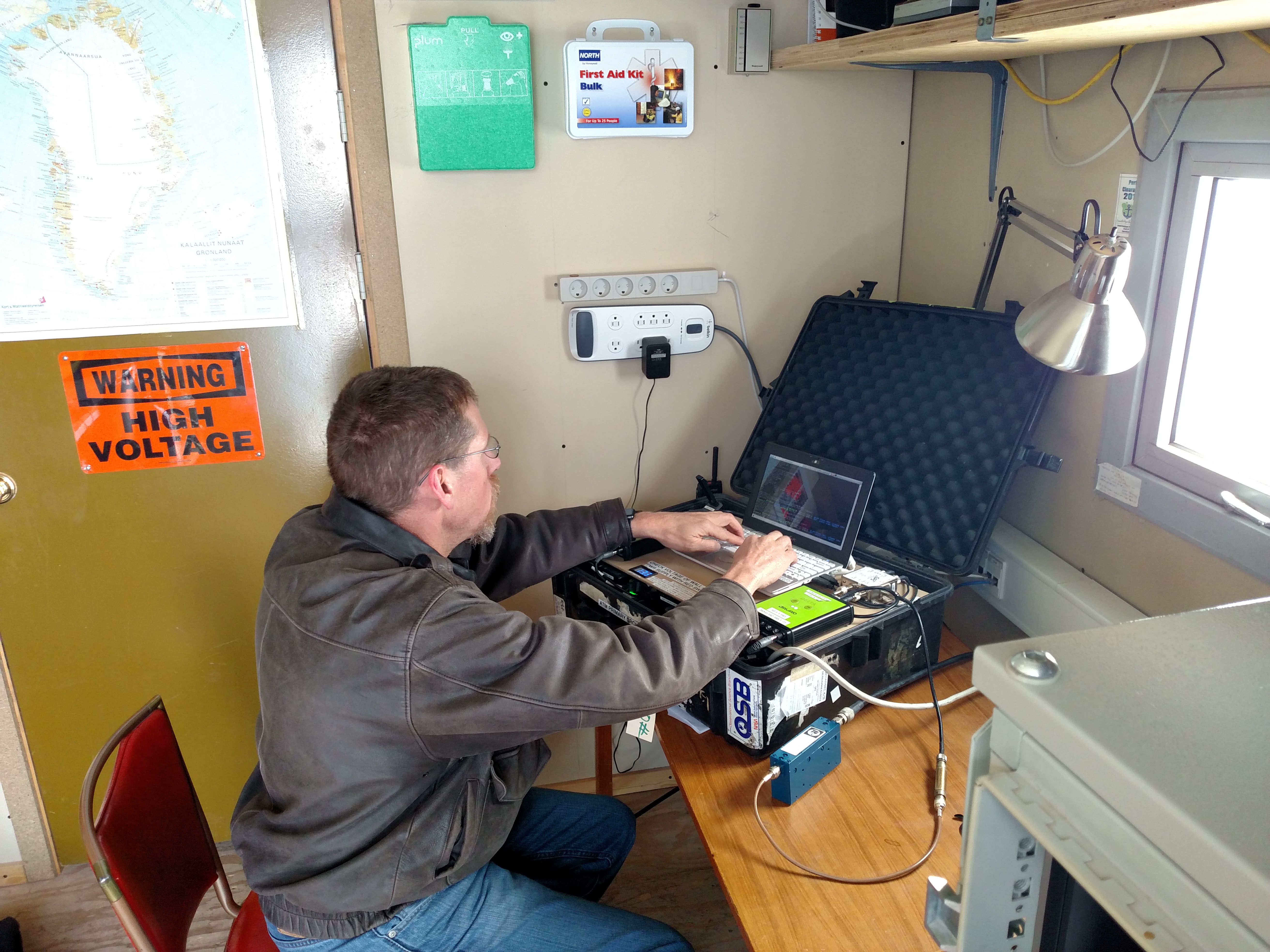 Airborne Topographic Mapper (ATM) Engineer Richard Mitchell monitors the GPS ground station at Building 8 on Thule Air Base. Along with monitoring instruments, Mitchell will download GPS data from the previous days flight to be processed with the airborne data collected at the same time. Thule Air Force Base, Greenland.
