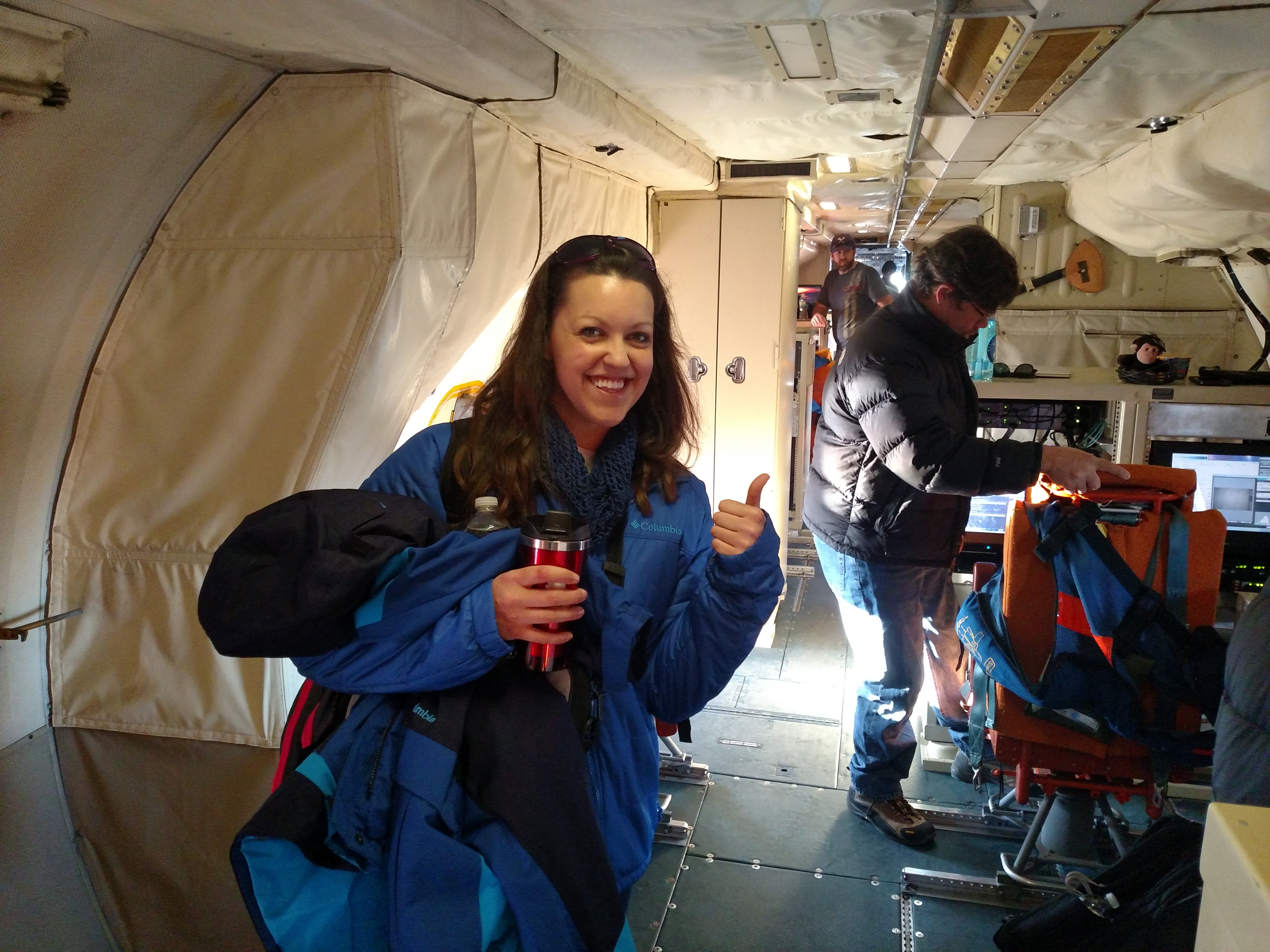 Kelly McCarthy familiarizes herself with "the tube" aboard the WP-3D Orion "Miss Piggy" for her first science flight with NASA's Operation IceBridge, aboard the WP-3D Orion at Thule Air Force Base, Greenland.