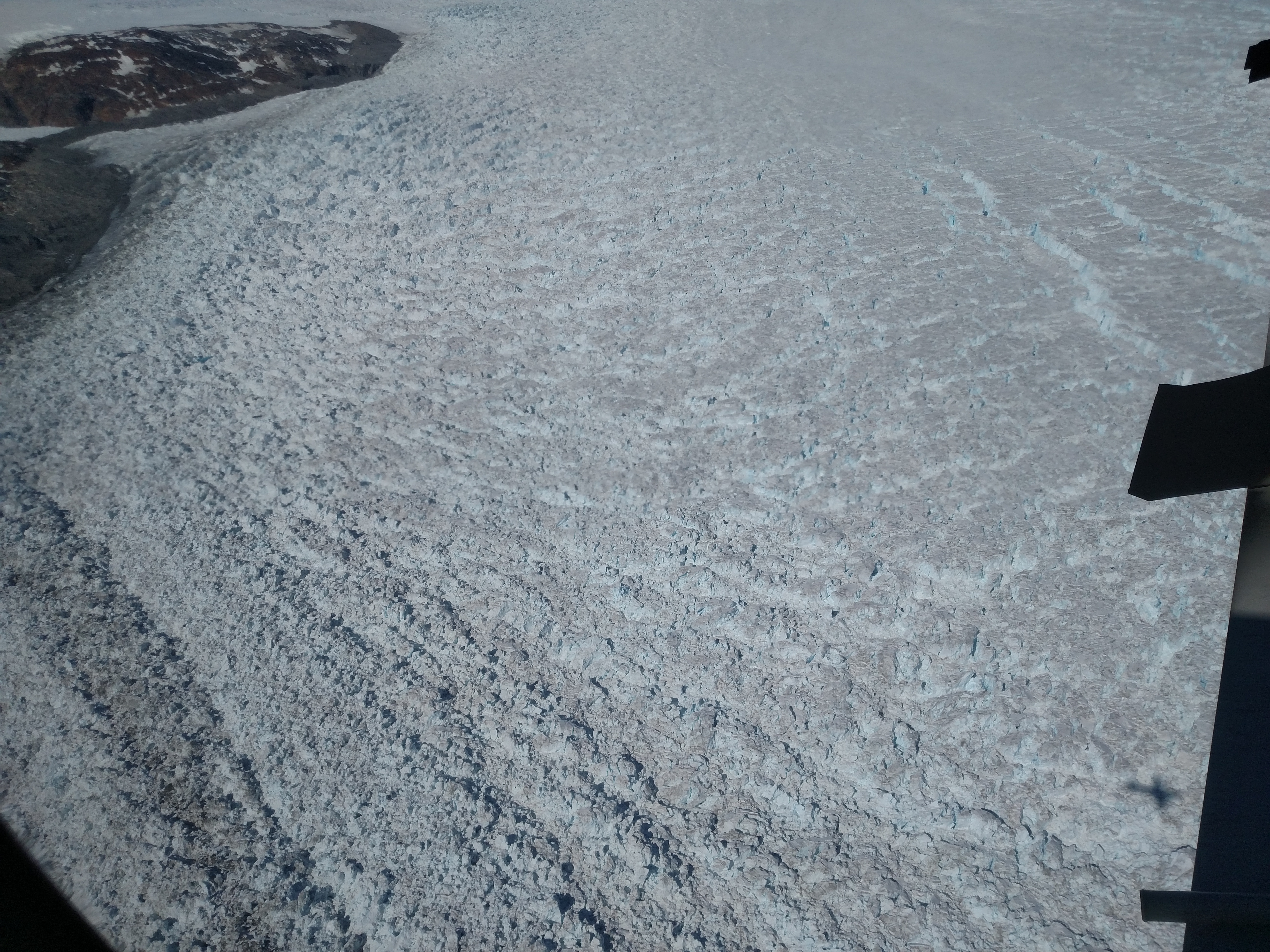 The WP-3D Orion aircraft used by NASA's Operation IceBridge casts its shadow on the textured surface of glaciers in southeastern Greenland. Aboard the WP-3D Orion over the Greenland Ice Sheet.