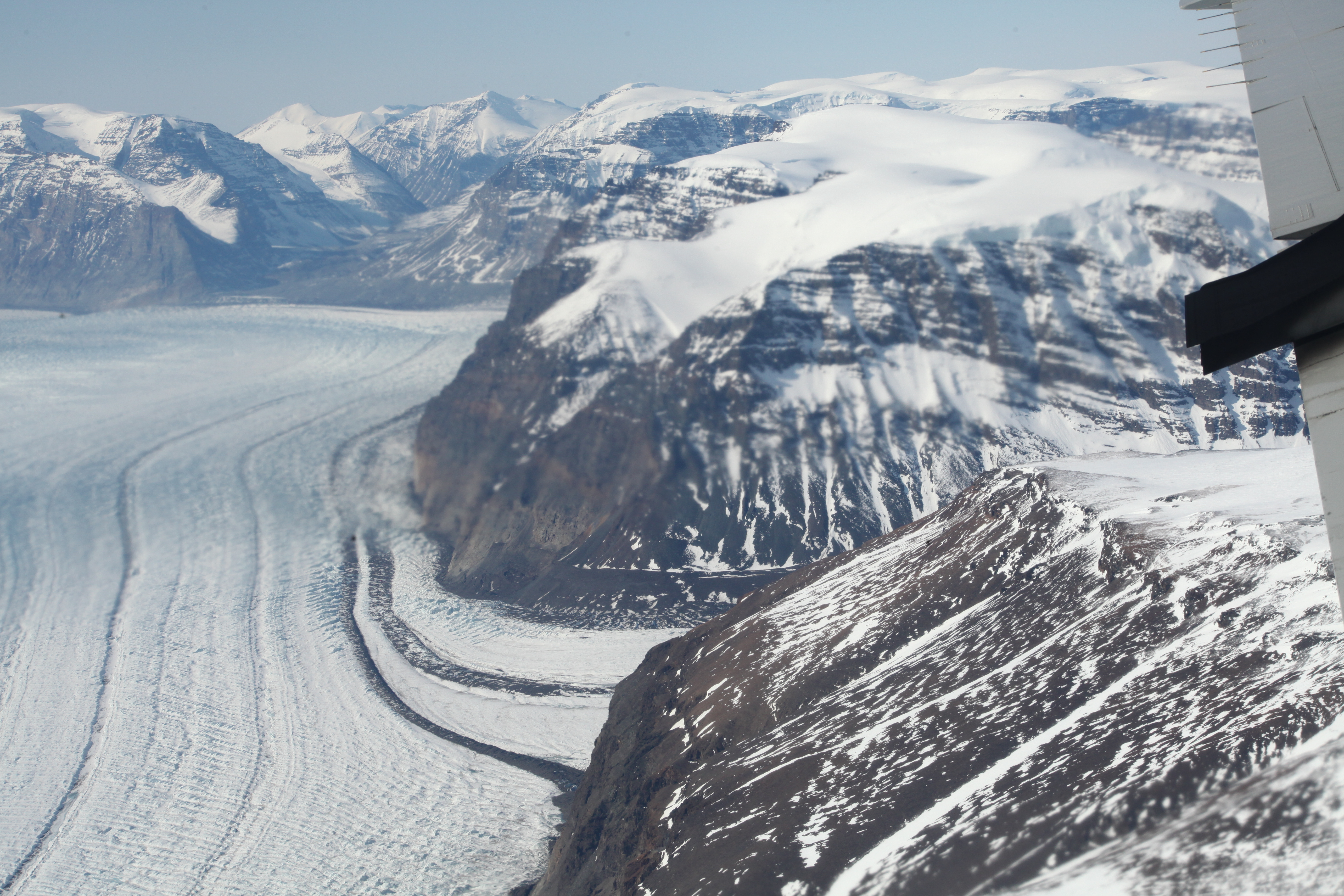 Several moraines are visible during the Southeast Coastal Mission. Aboard the WP-3D Orion over the Greenland Ice Sheet.