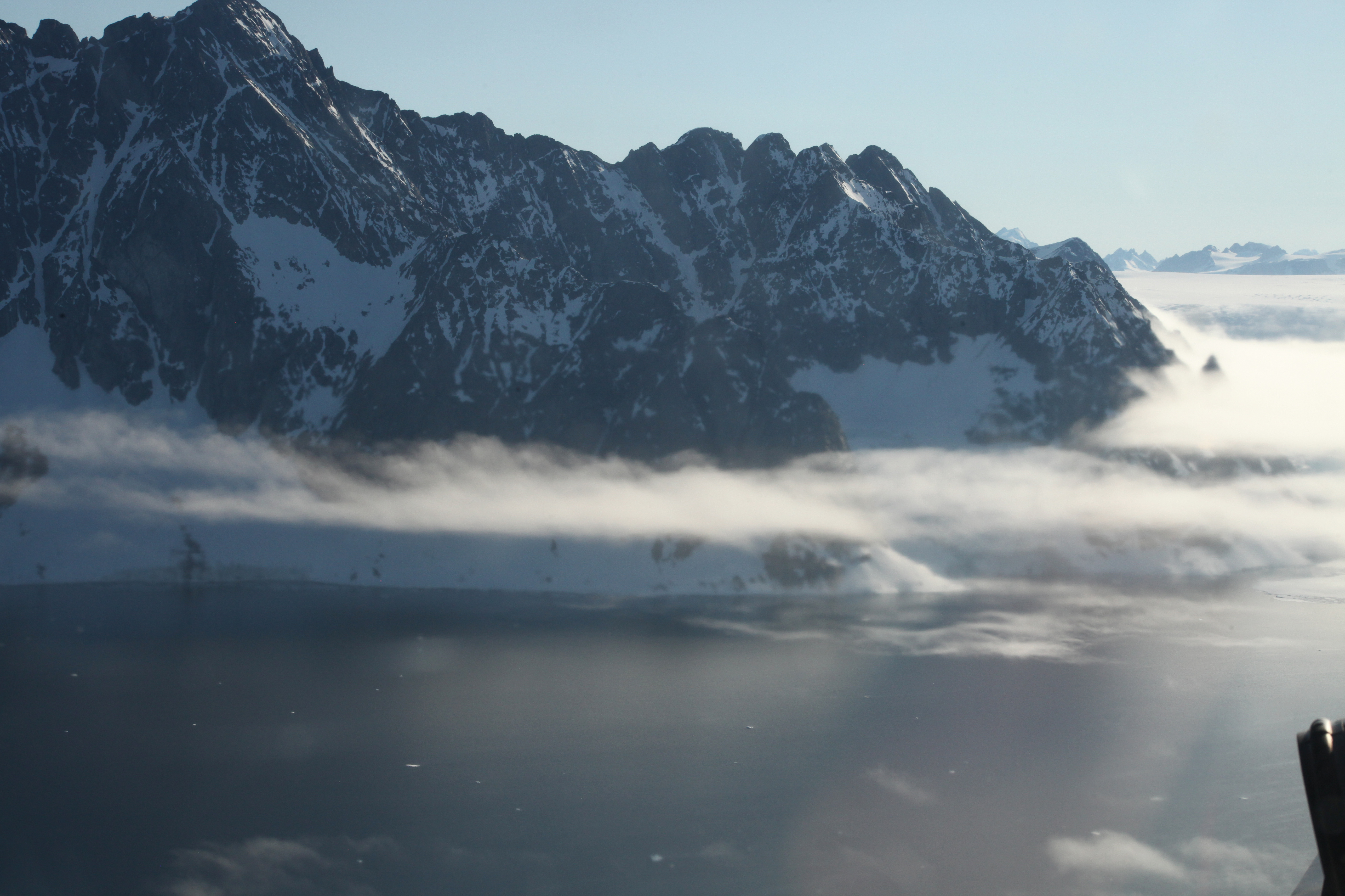 Beneath a light layer of low-hanging fog, open water borders the southeastern coast of Greenland as the melt season begins. Aboard the WP-3D Orion over the Greenland Ice Sheet.