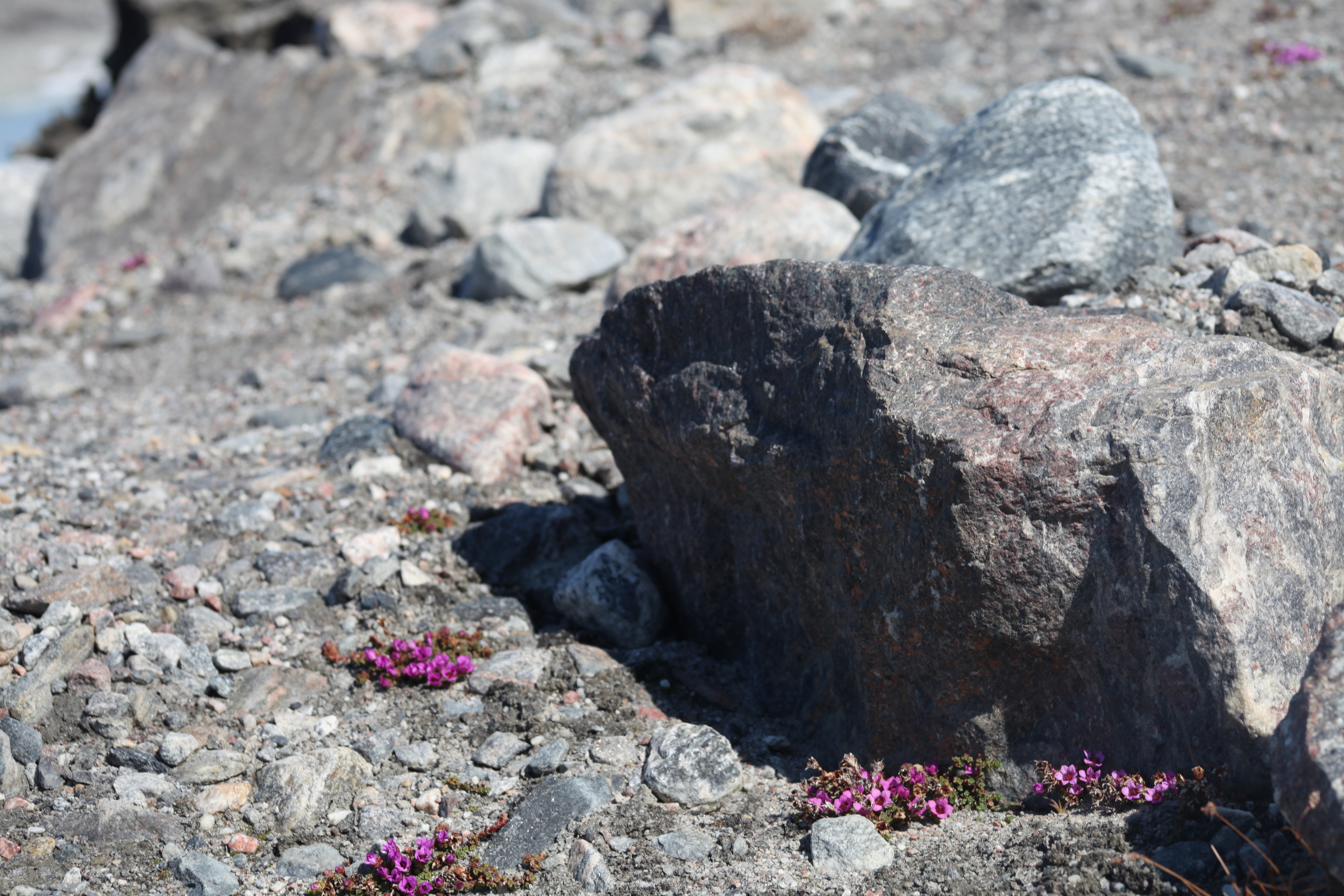On the way to the terminal moraine of the Greenland Ice Sheet from Kangerlussuaq, Greenland, low lying vegetation peeks out adding a pop of purple.