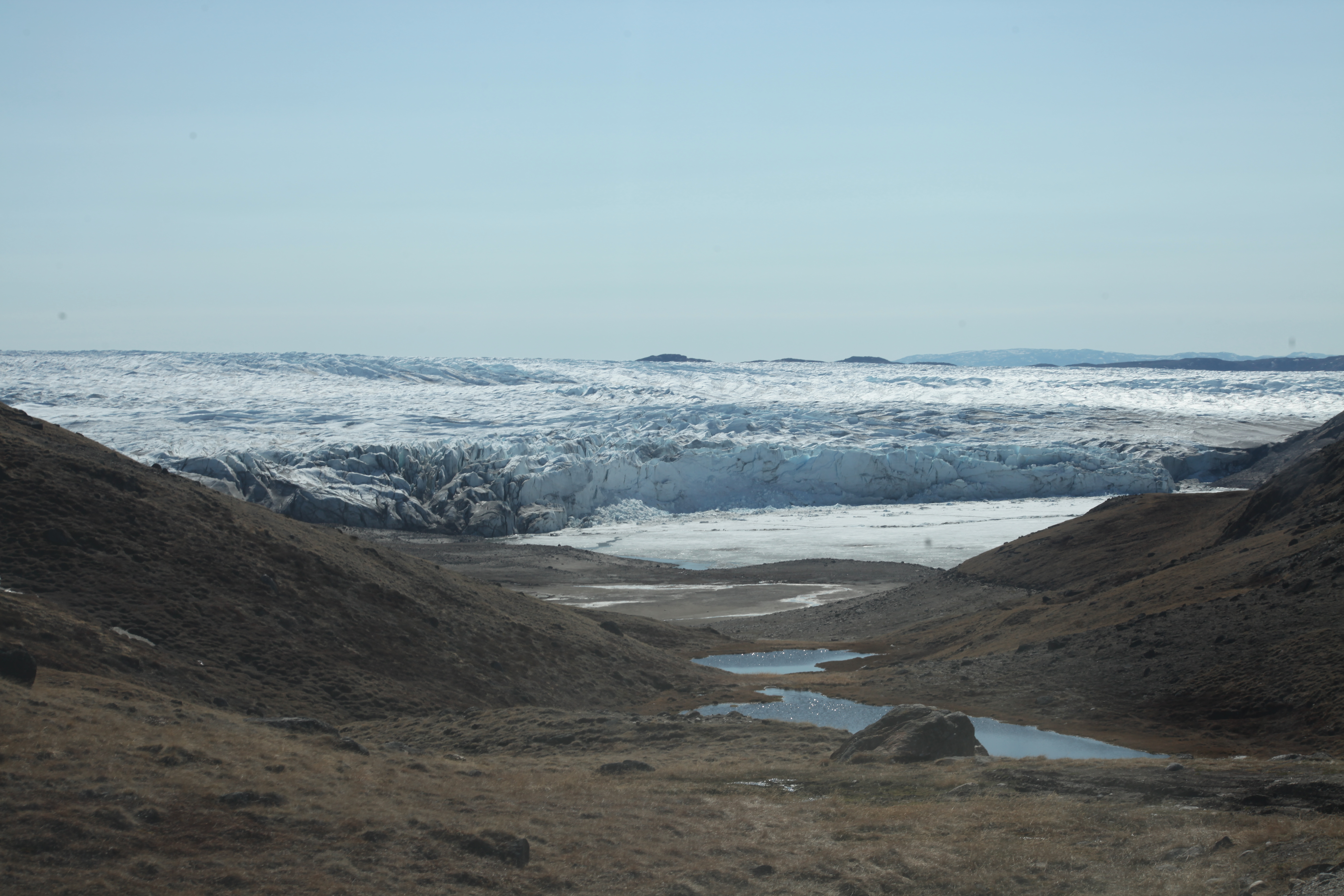The land-terminating Russell Glacier calves as meltwater fills depressions and drainage systems. Russell Glacier, Greenland.