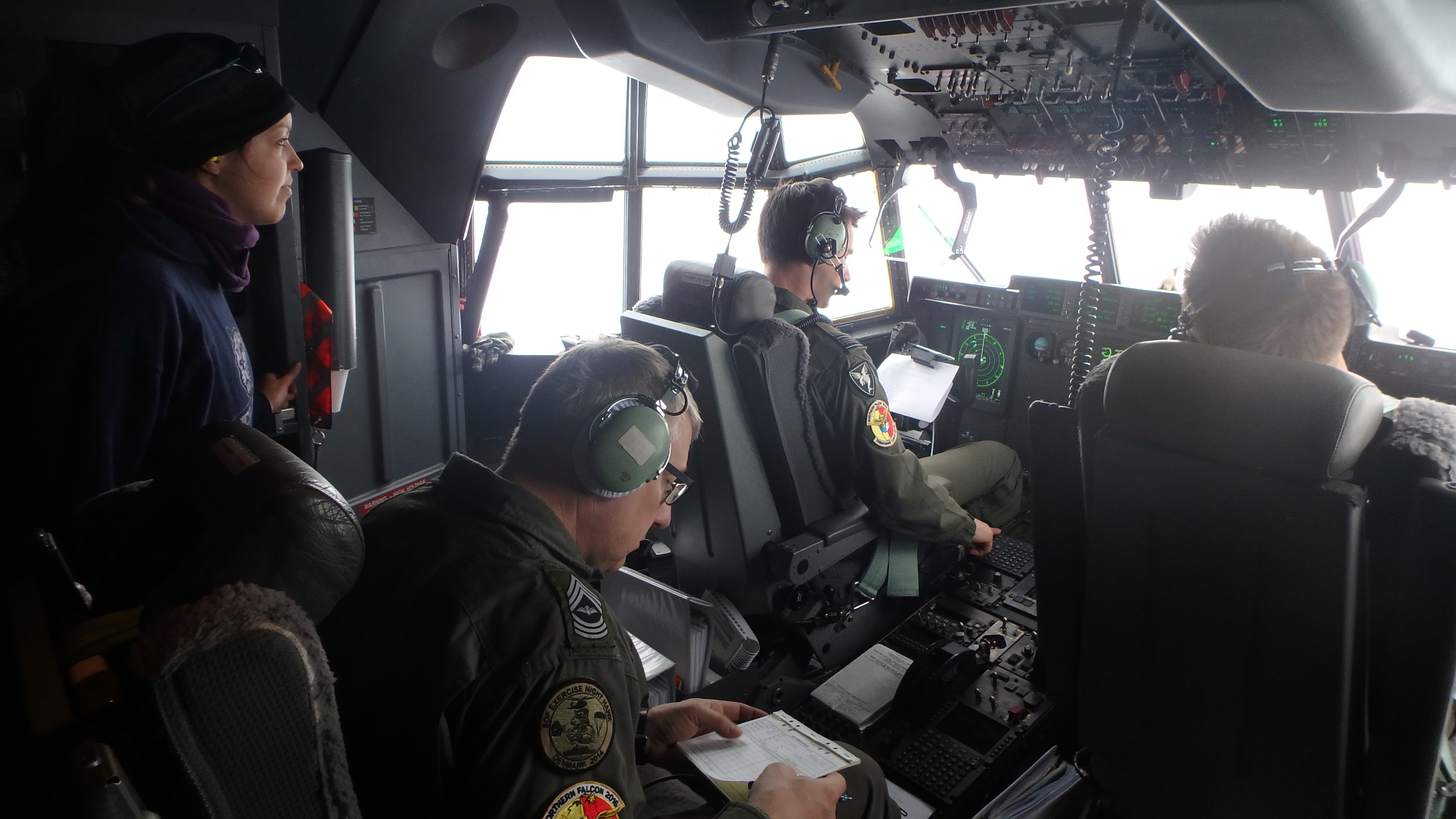 Kelly McCarthy experiences life in the cockpit en route to Station Nord with a Royal Danish Air force flight crew during a refuel mission. Aboard the C-130 over the Greenland Ice Sheet.