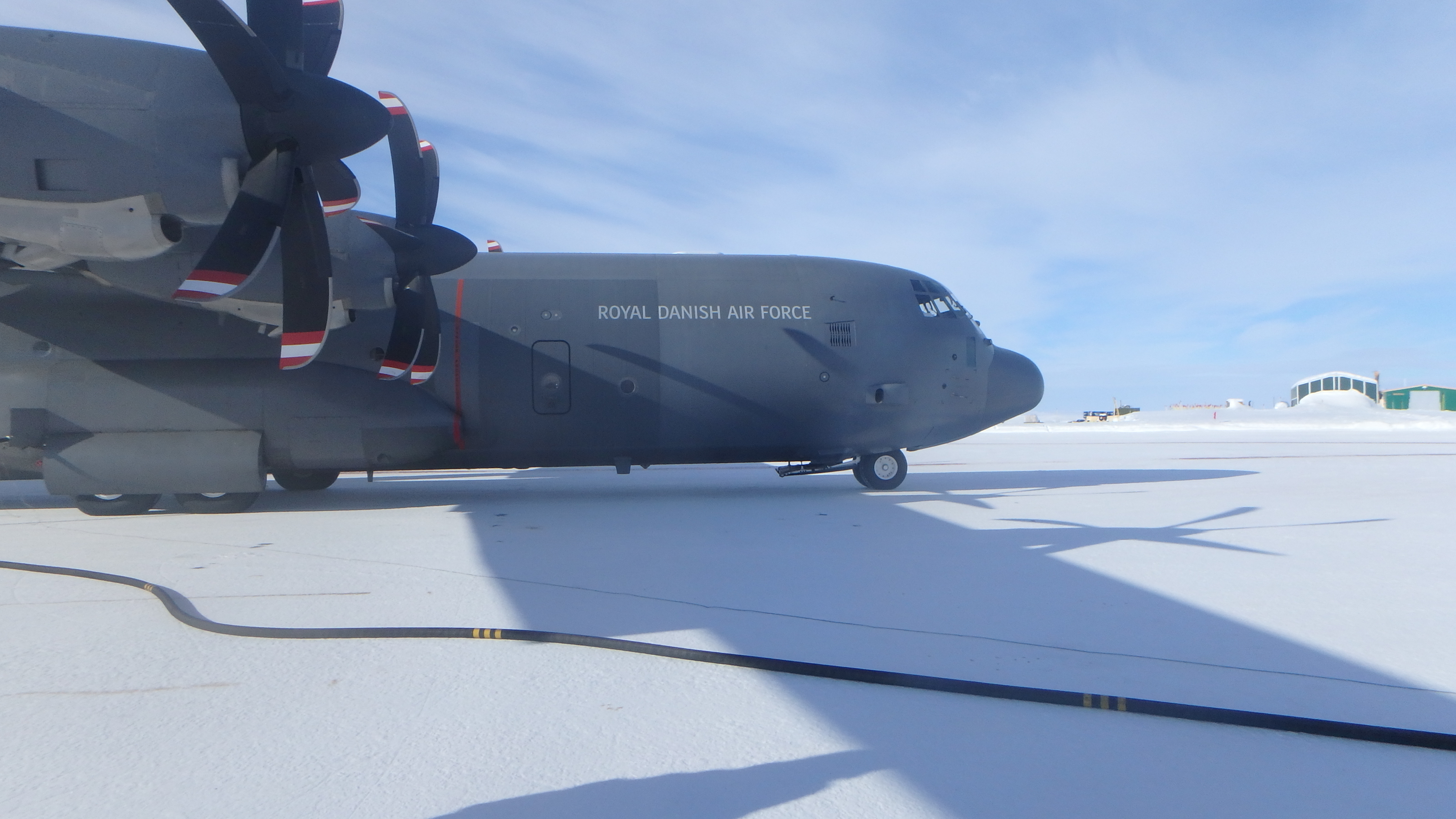 The Danish Air Force C-130 receives its fuel recharge as the science camp at Station Nord receives its own refuel supply. Station Nord, Greenland.