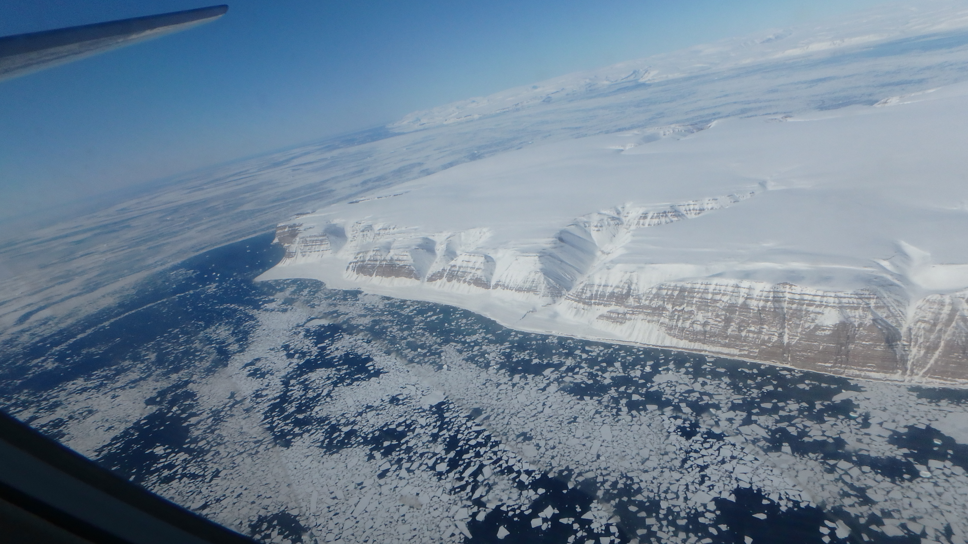 Open water is revealed beneath broken sea ice as the melt season begins off the coast of northwestern Greenland. Aboard the WP-3D Orion over the Arctic Ocean near the edge of the Greenland Ice Sheet.