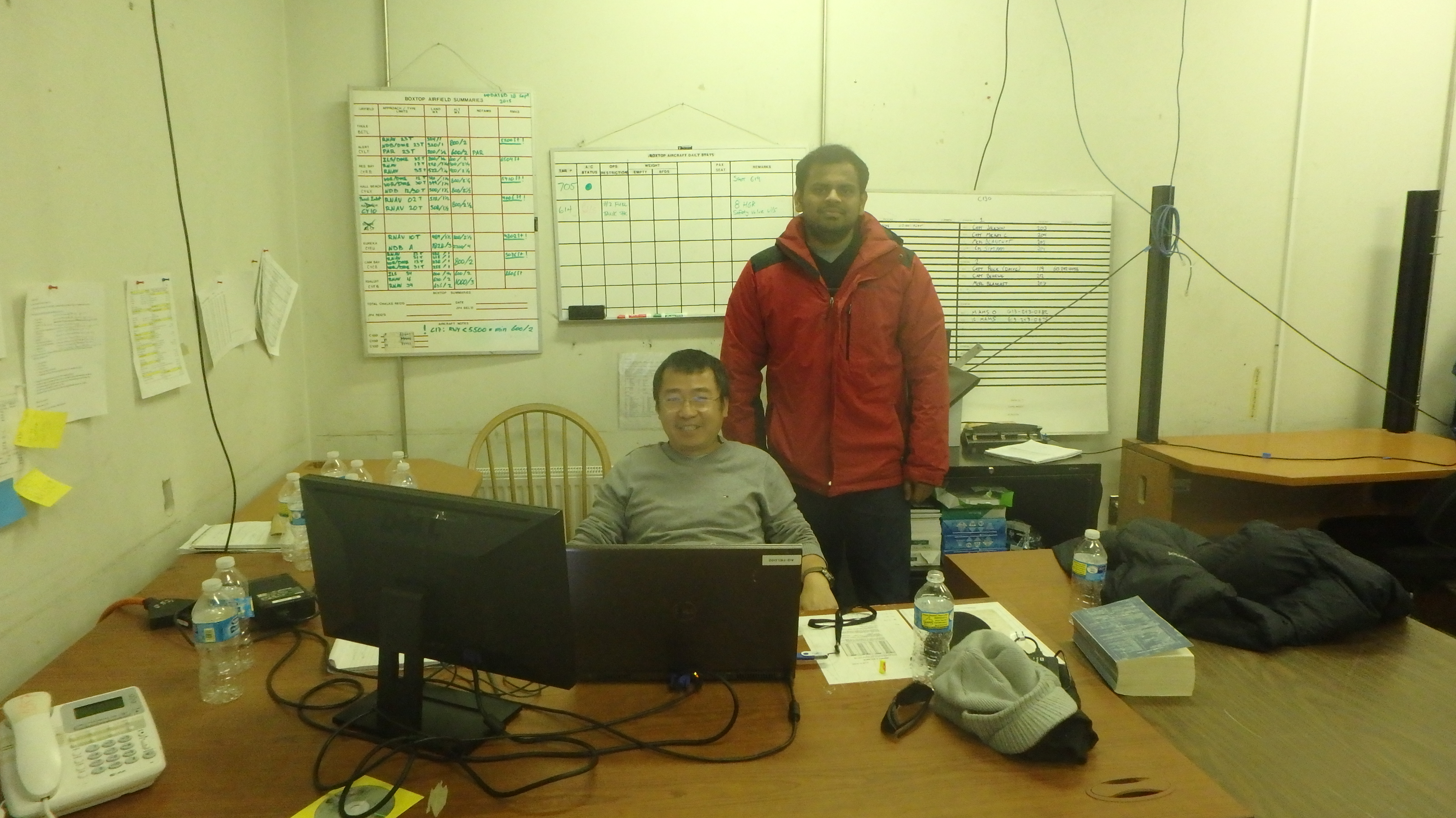CReSIS scientist JiLu Li and Kansas University student Akhilesh Mishra set up a makeshift office and data collection space in the Building 8 hangar at Thule Air Force Base, Greenland.