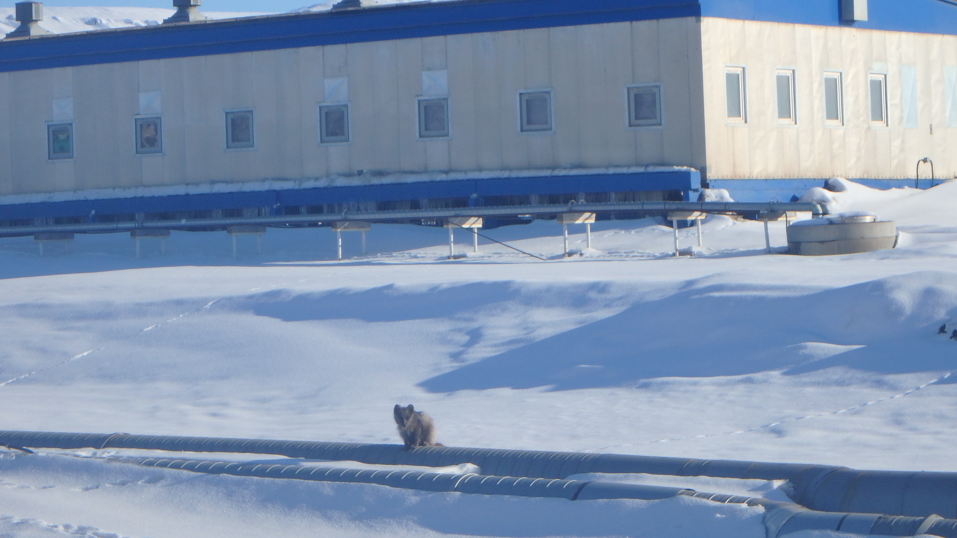 An Arctic fox carefully takes in his surroundings perched on a pipe amidst the flat top barracks of Thule Air Force Base, Greenland.