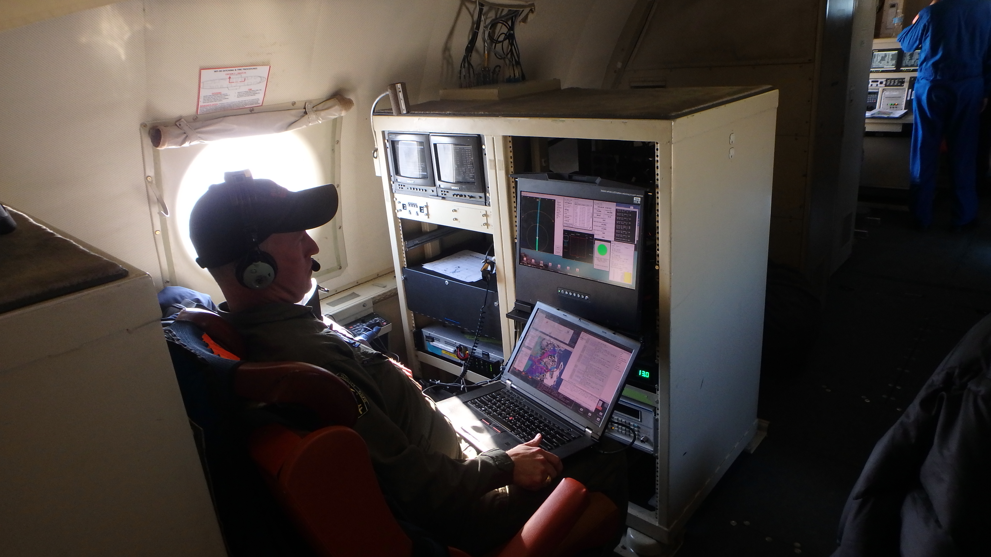 Mission scientist and Airborne Topographic Mapper (ATM) expert John Sonntag communicates closely with the flight crew as he monitors the flight line during a priority mission segment by segment. Aboard the WP-3D Orion over the Greenland Ice Sheet.