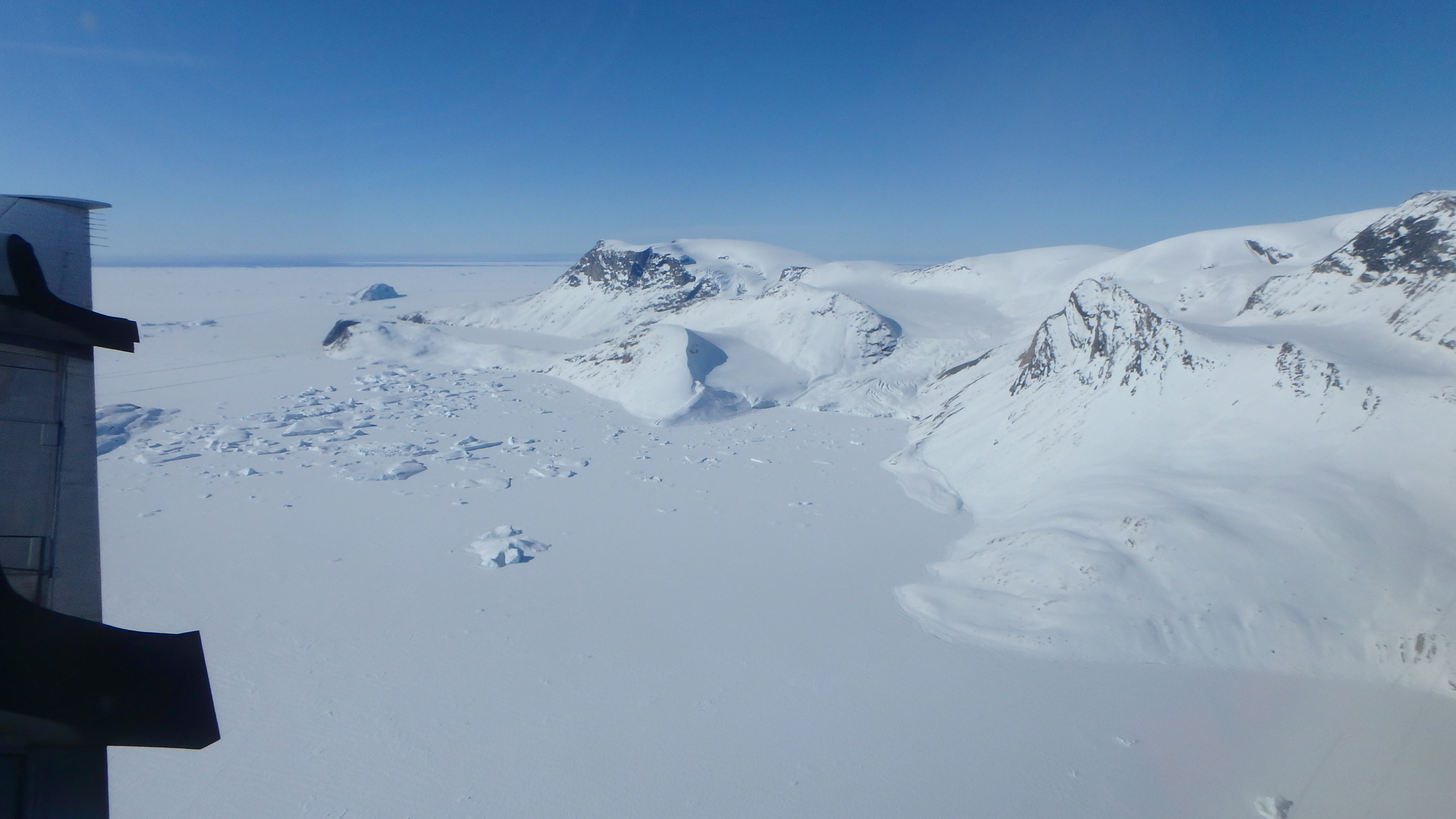 Tidewater glaciers drain into the sea, pushing large icebergs through multi-year sea ice. Aboard the WP-3D Orion over the Arctic Ocean near the edge of the Greenland Ice Sheet.