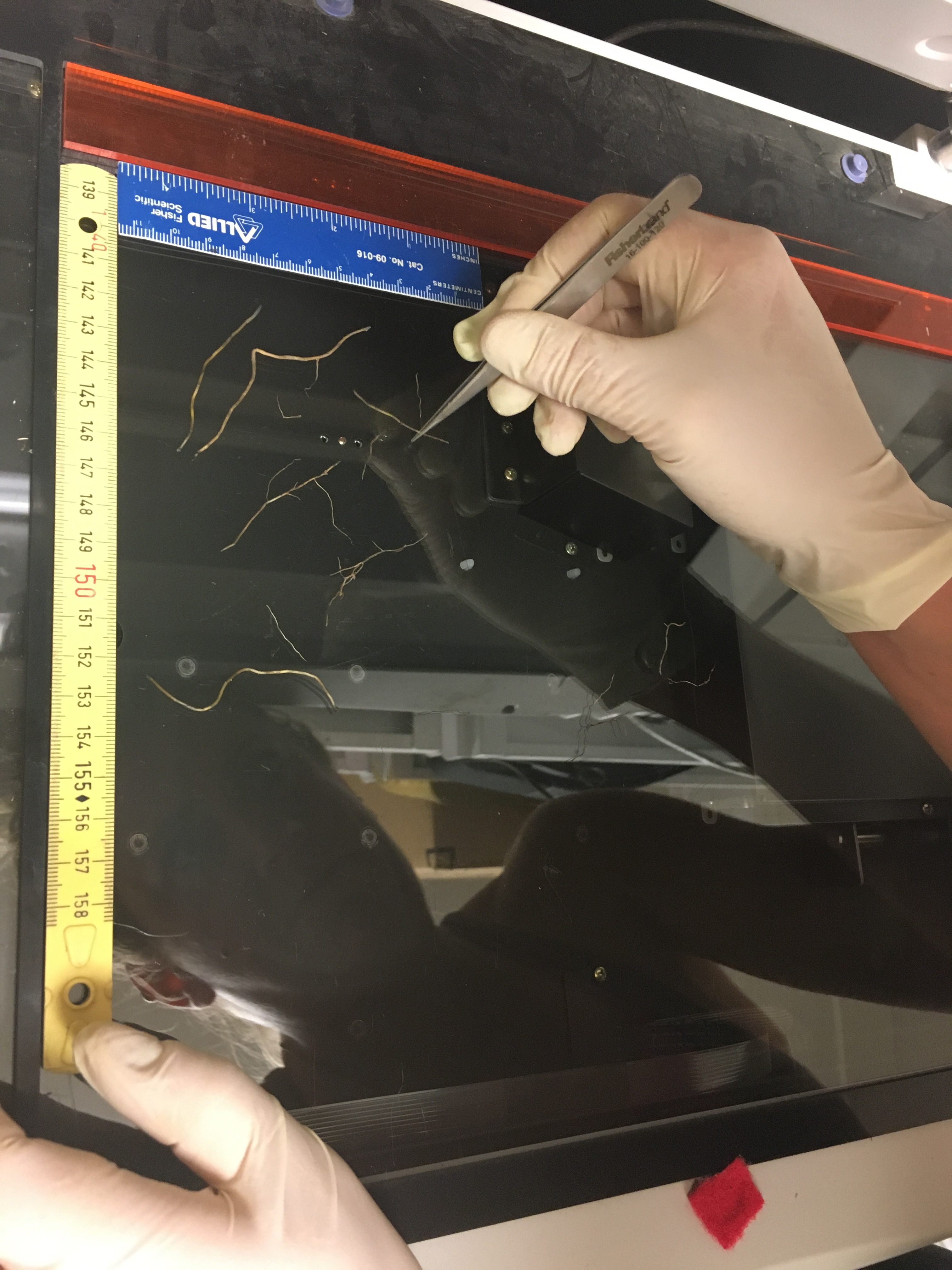 Each tiny root is carefully placed on the scanner to create a digital file and measure the overall length. Toolik Field Station, Alaska.