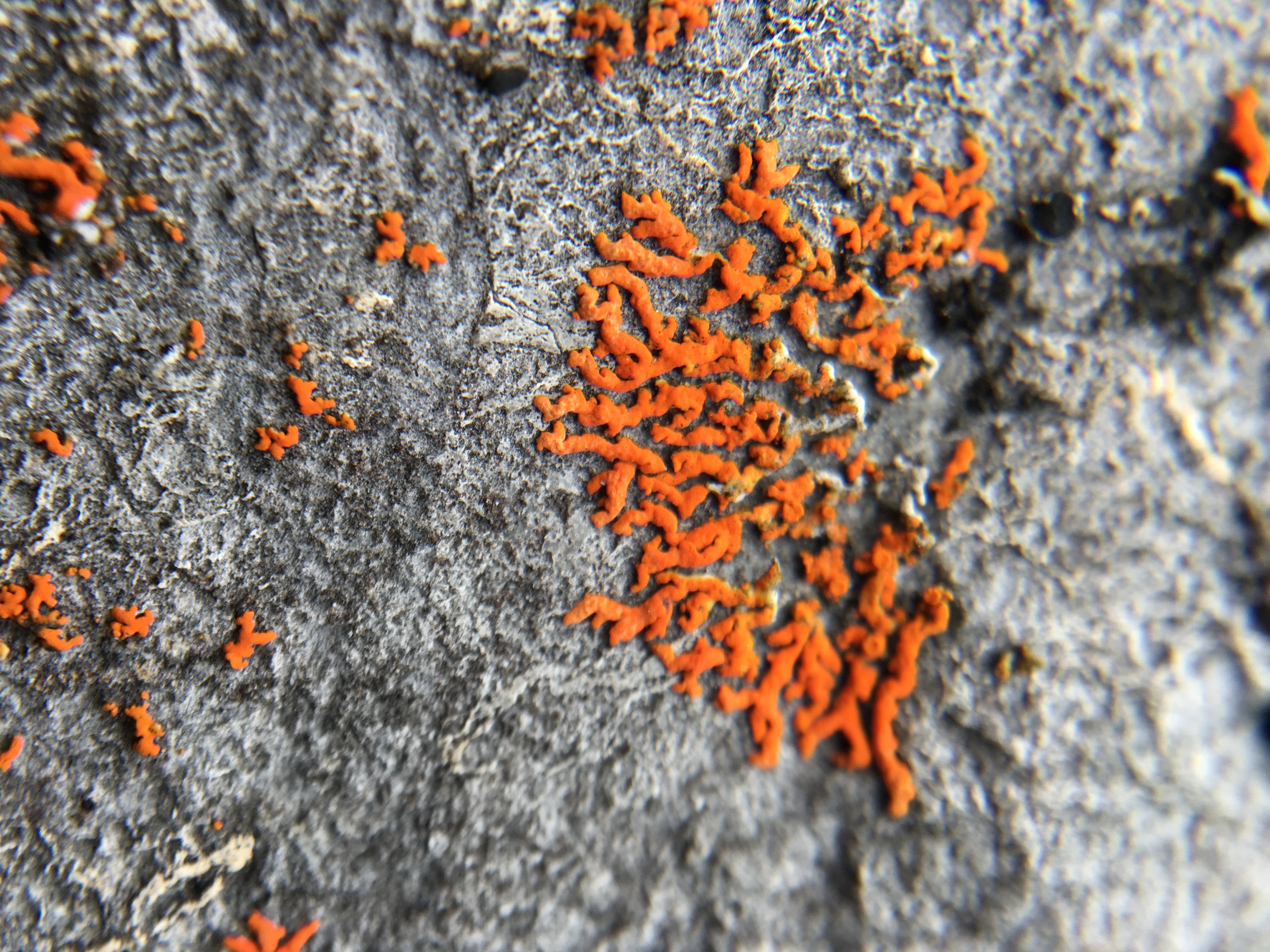 Bright orange lichen (Xanthoria elegans) growing on a rock. North Slope, Alaska.