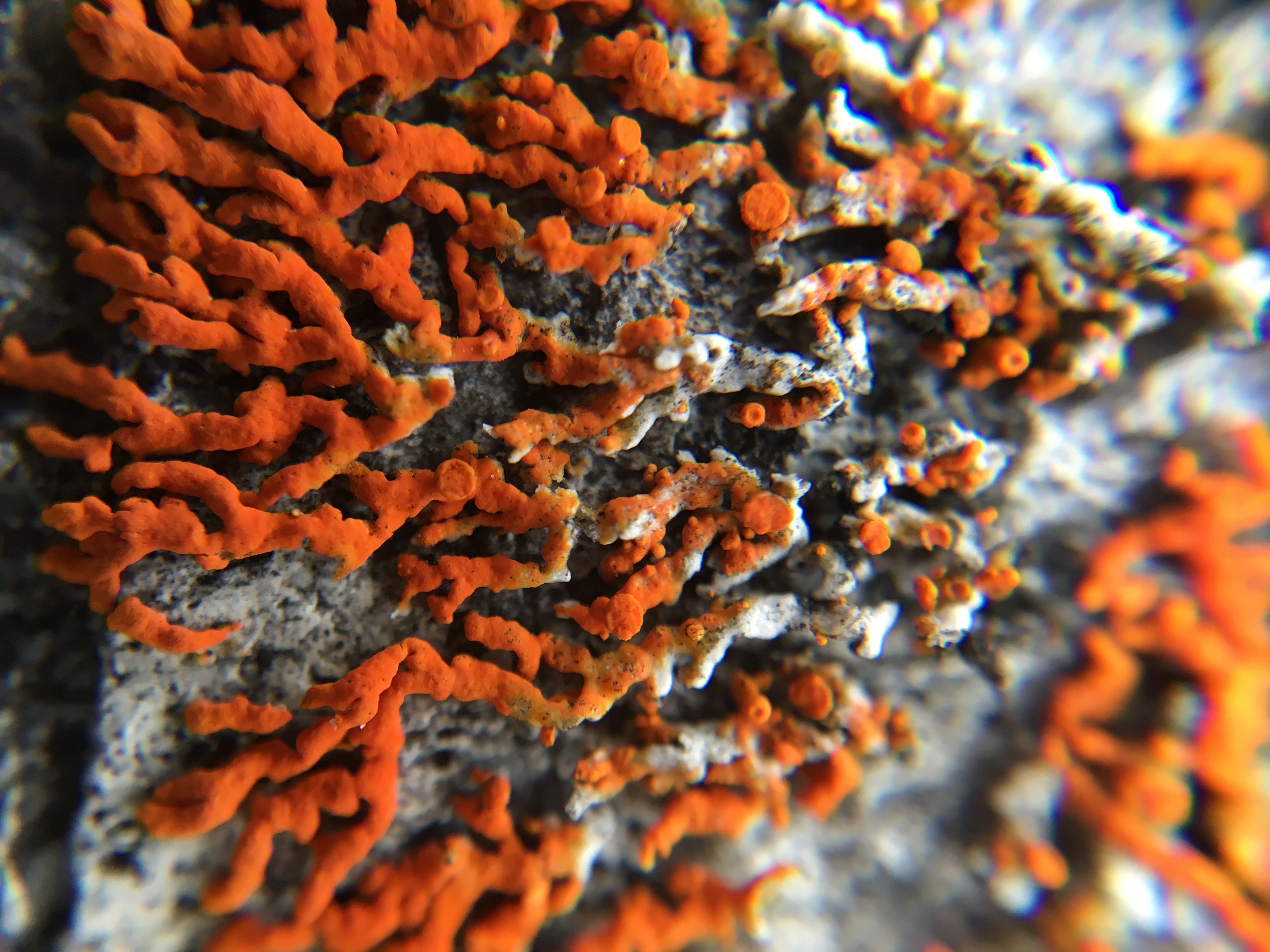 Bright orange lichen (Xanthoria elegans) growing on a rock. North Slope, Alaska.